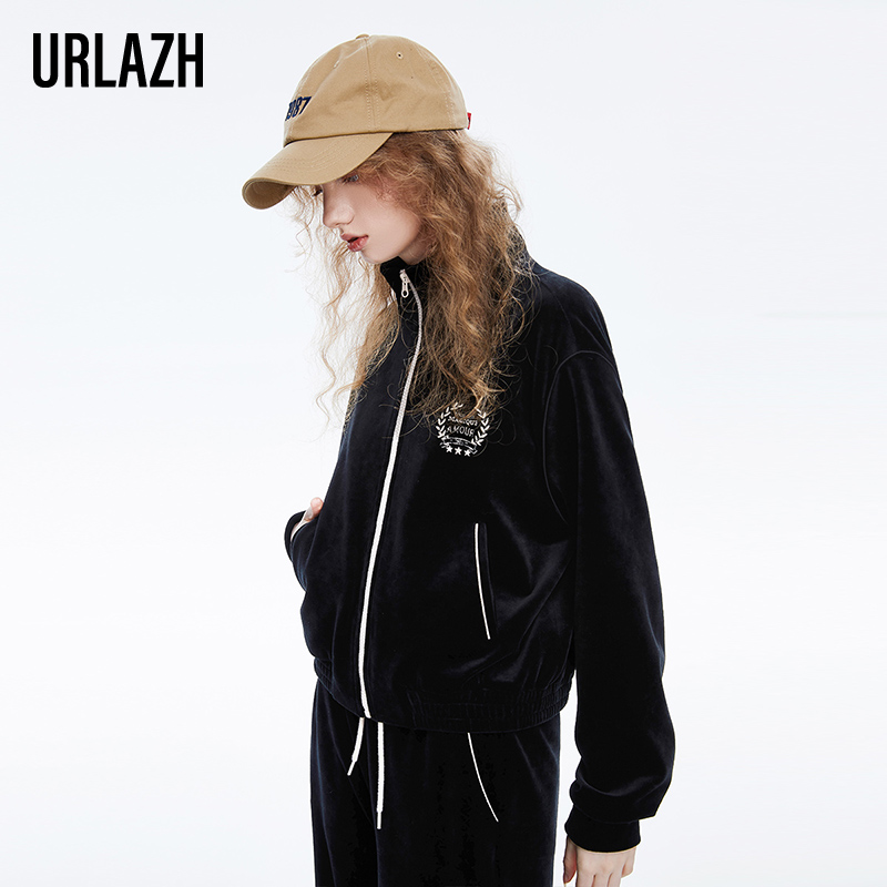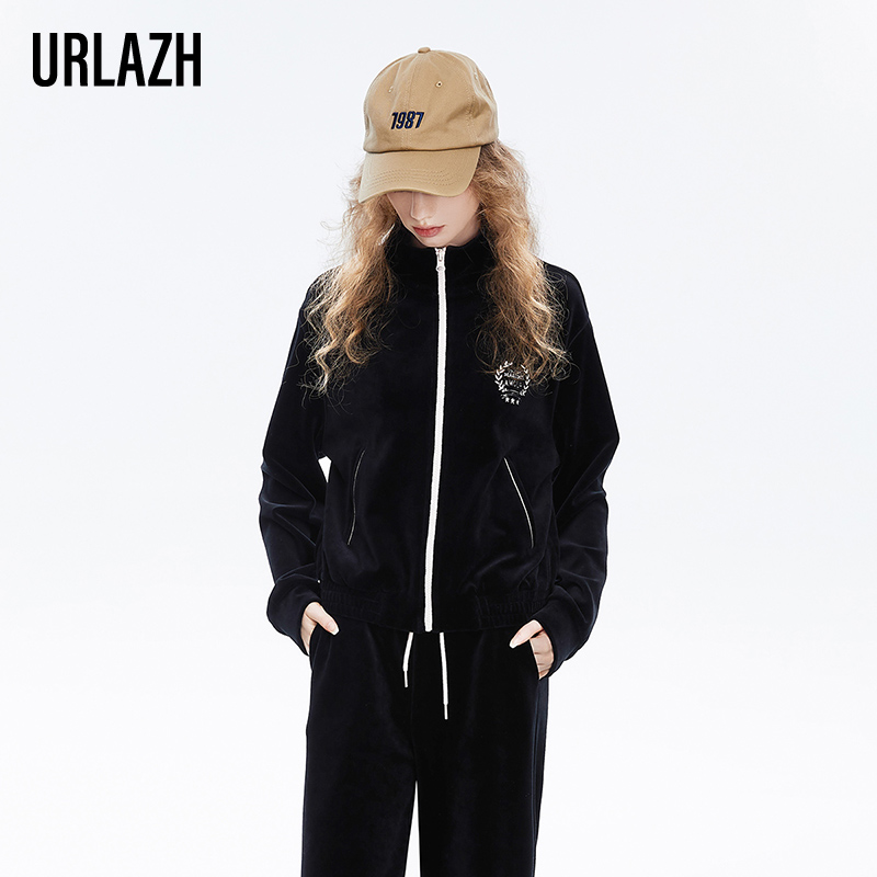 运动休闲刺绣外套上衣女 复古气质黑色短款 URLAZH有兰春季 新款