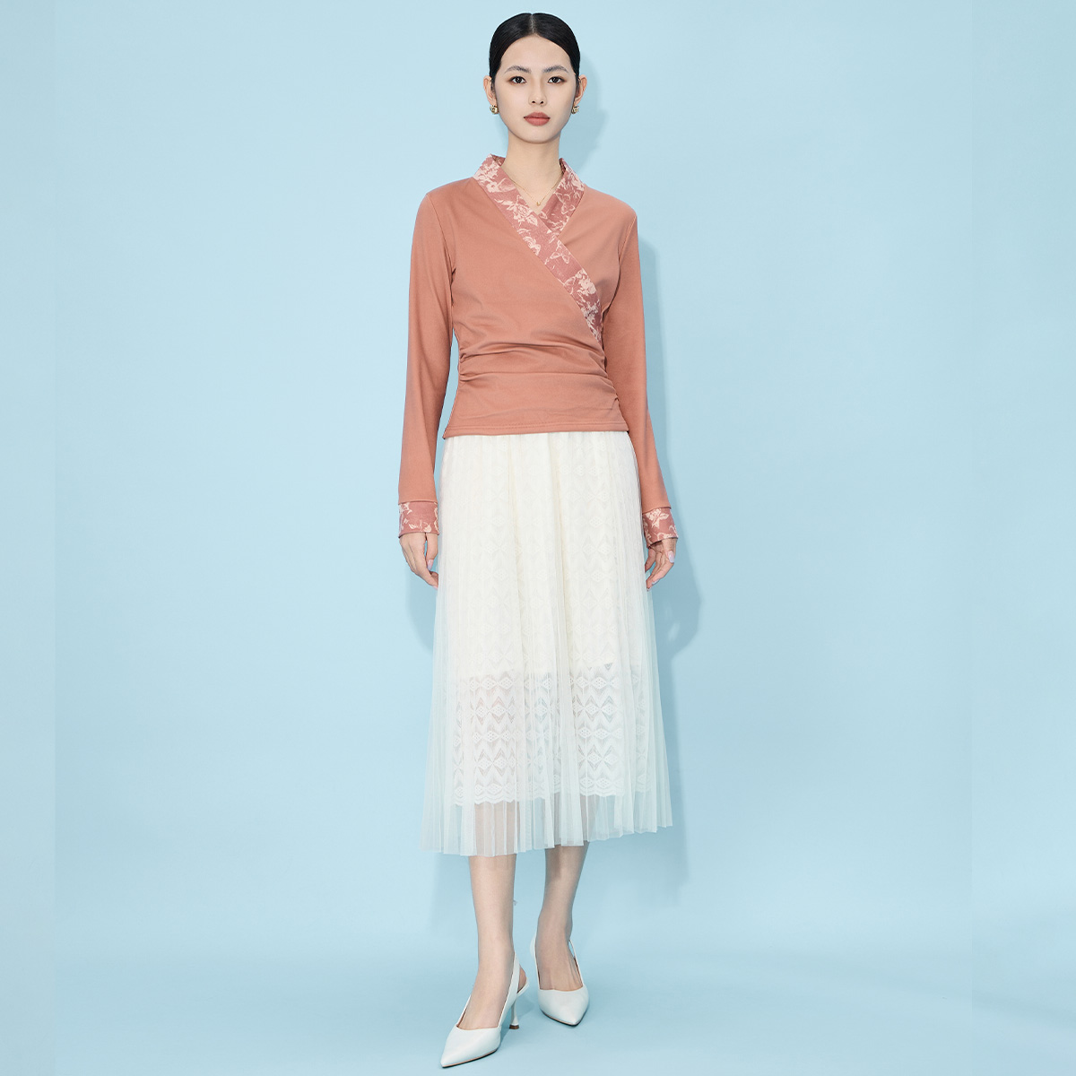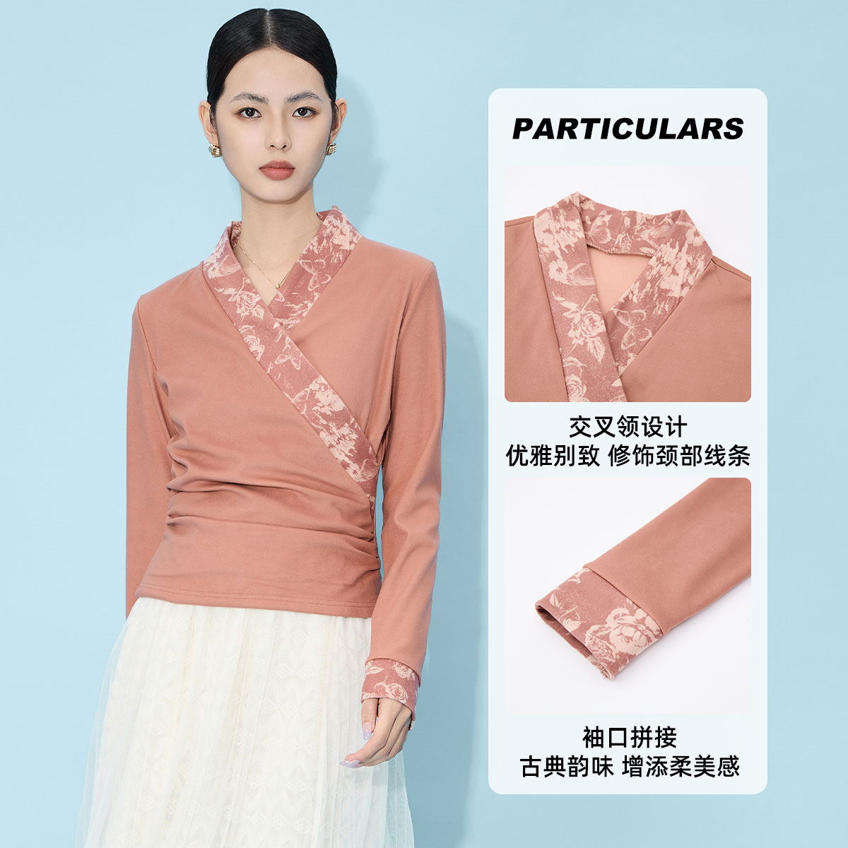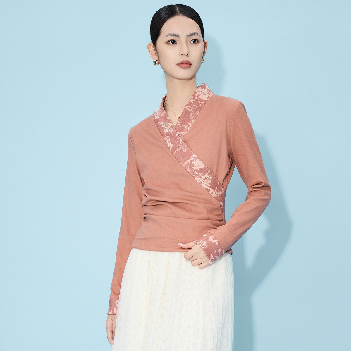 长袖 马天奴2025春夏新款 新中式 时尚 气质 粉色V领上衣印花拼接修身