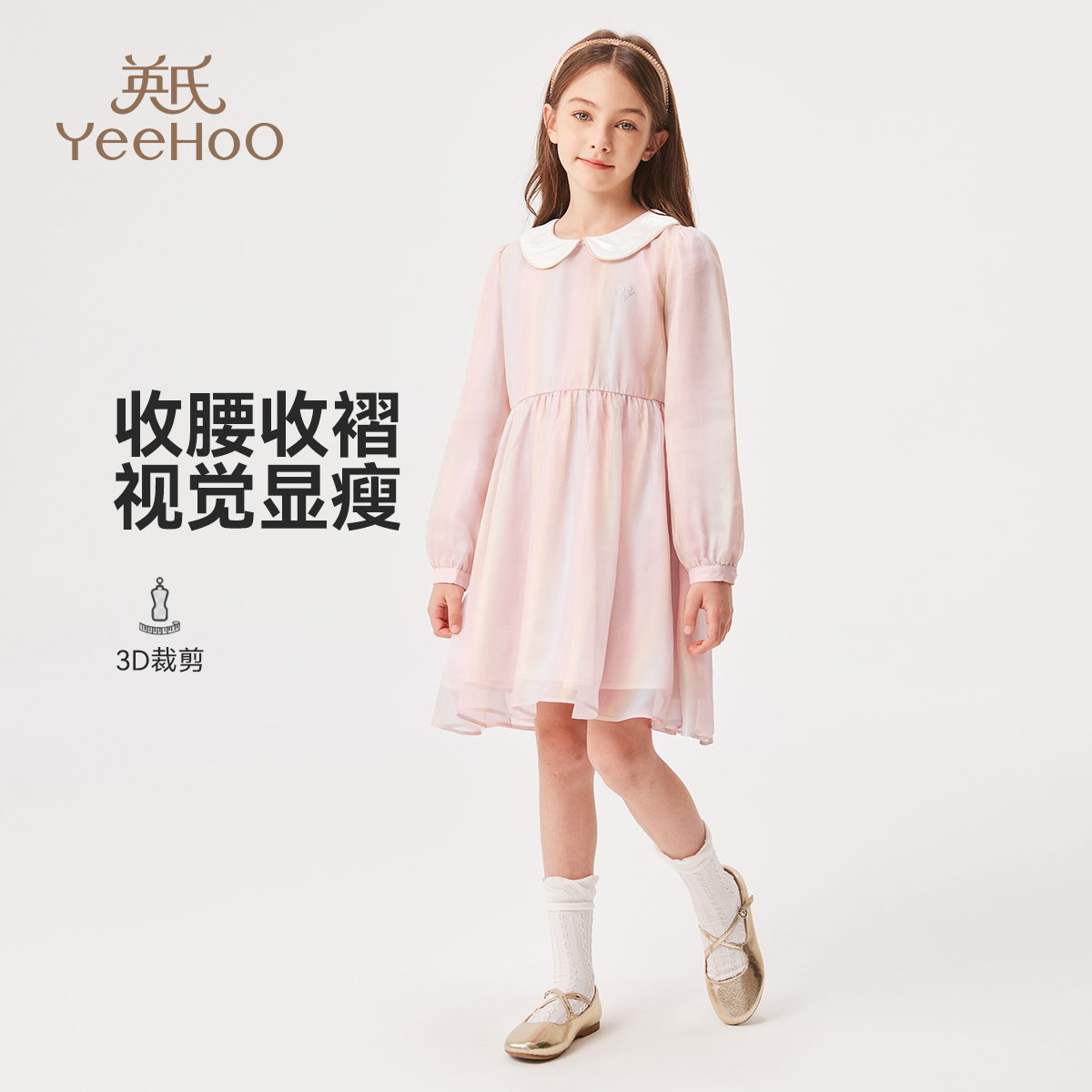 网纱裙子 儿童公主裙娃娃领闪光裙长袖 英氏女童连衣裙2025秋装 新款