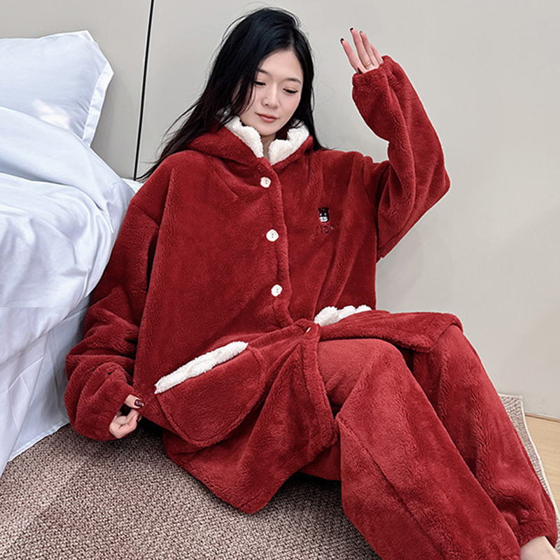 红色本命年睡衣女冬款 200斤胖mm宽松珊瑚绒加绒加厚家居服冬 大码