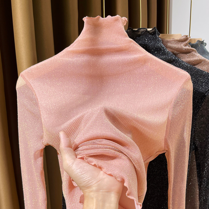 蕾丝内搭小衫 黑色高领网纱打底衫 木耳边亮丝薄款 2025新款 女 女长袖