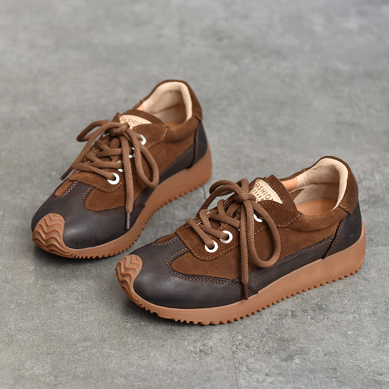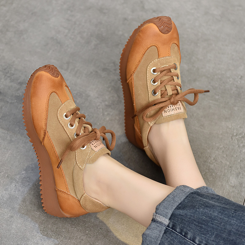 圆头层牛皮中跟系带运动鞋 百搭休闲女真皮软底阿甘鞋 时尚 2024秋季