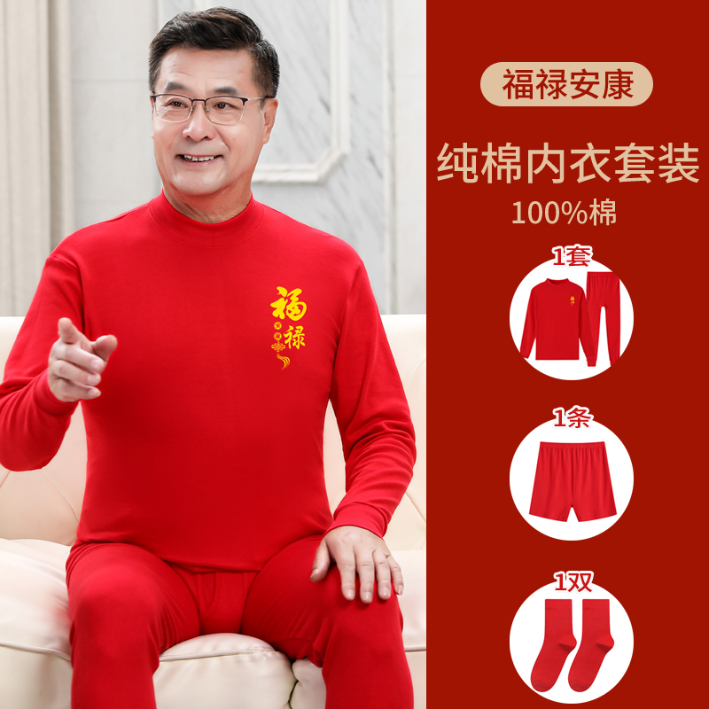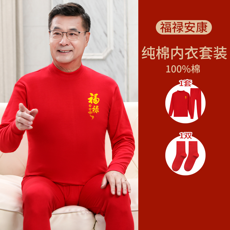 爸爸秋衣秋裤 男纯棉毛衫 大红色爷爷属马 老年人本命年内衣套装 新款