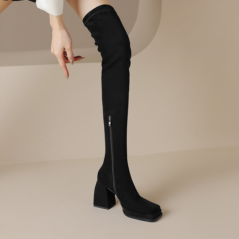 过膝长靴女厚底加绒靴子2025秋季 黑色粗跟弹力瘦瘦靴高跟袜靴 新款
