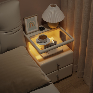 墨乔白色床头柜奶油风卧室实木带灯床边柜简约一体带保险箱隐藏式