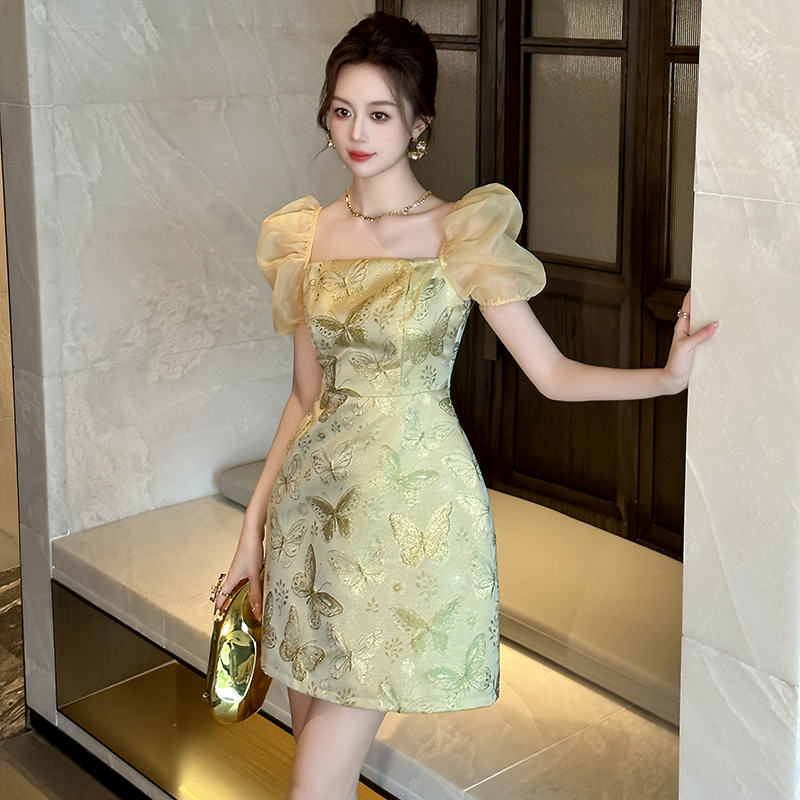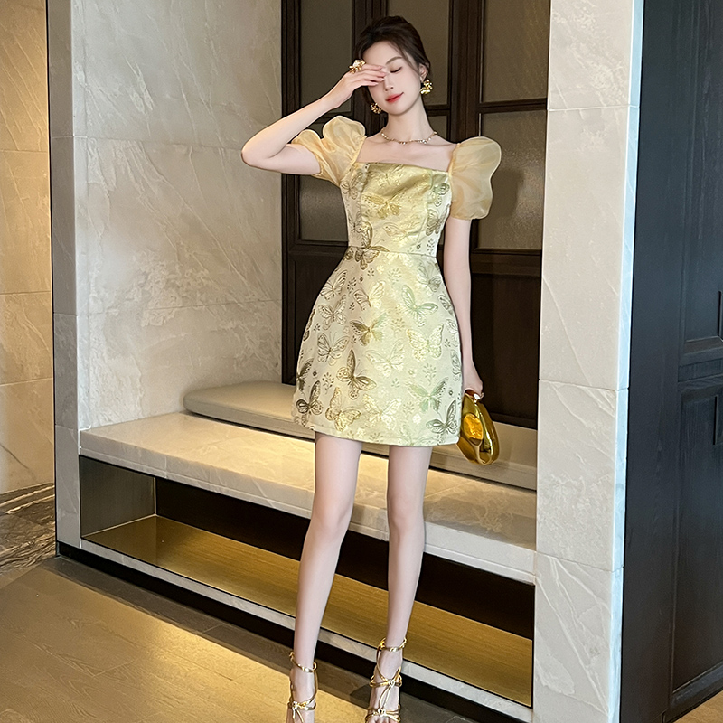 方领a字裙 短款 中式 优雅气质连衣裙高贵名媛风金色蝴蝶提花网纱袖