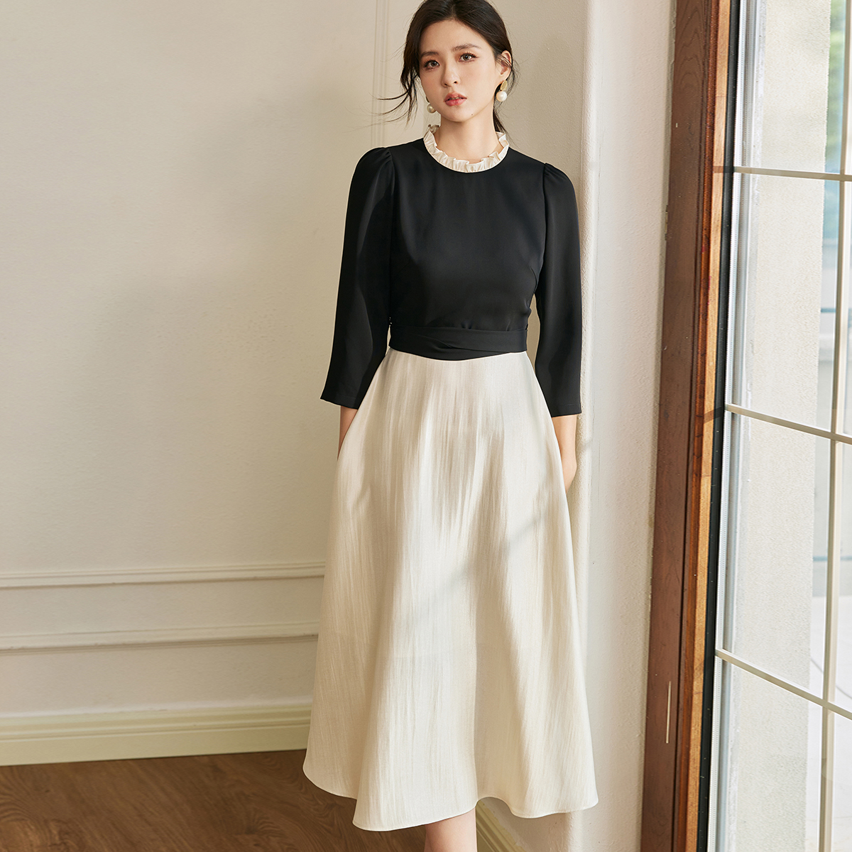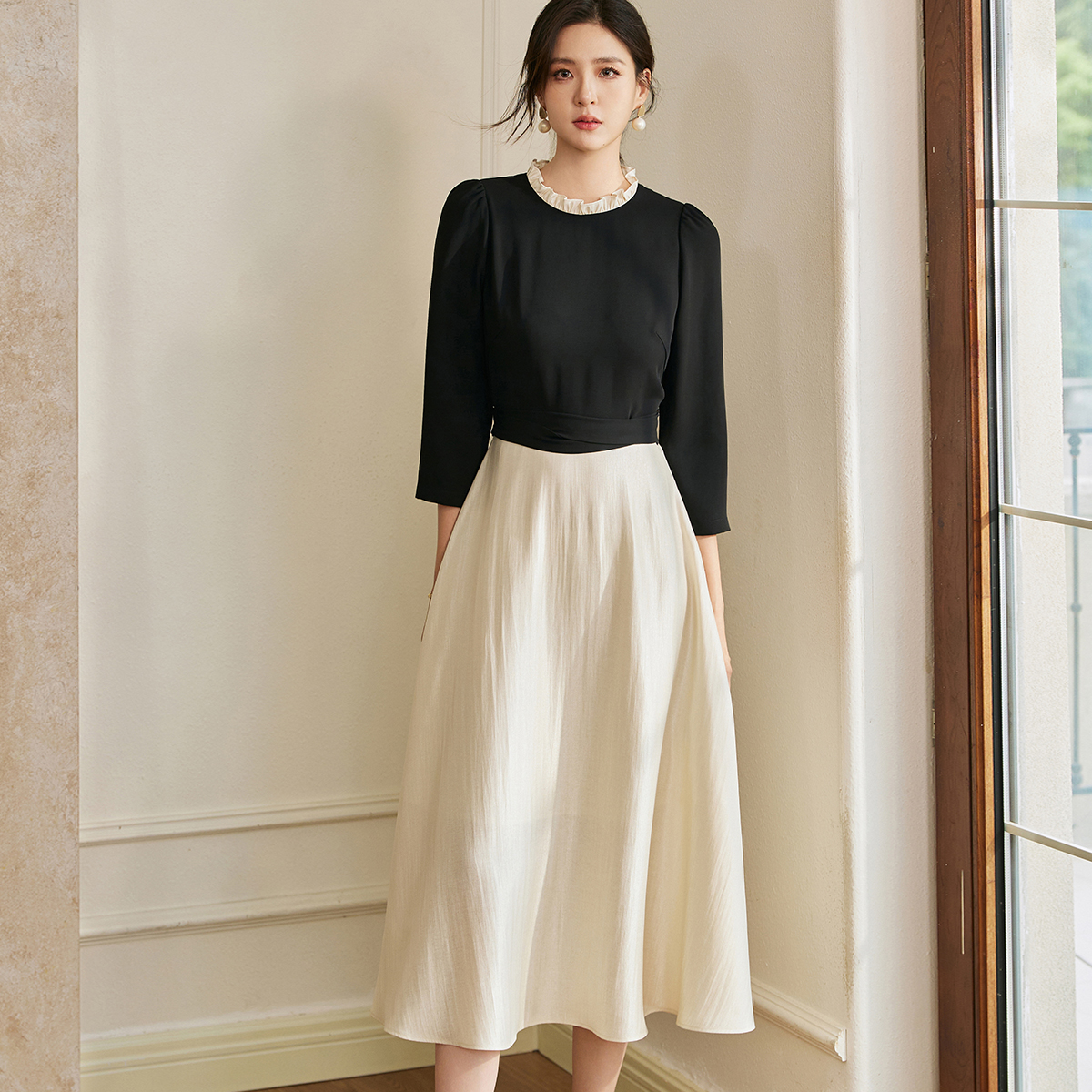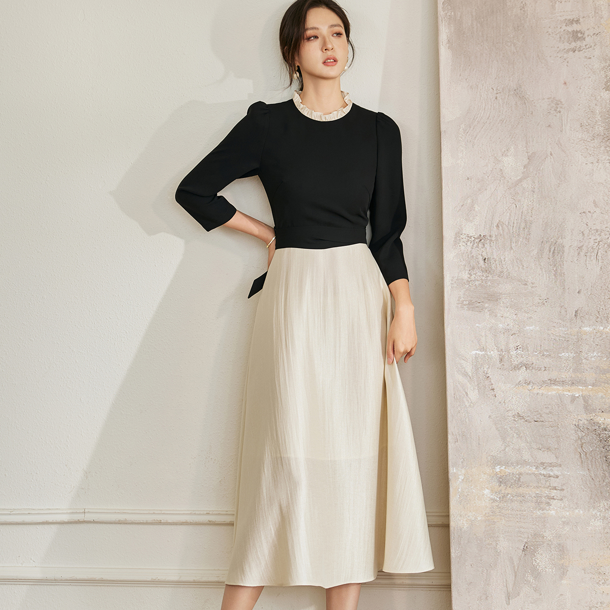 时尚 罗衣法式 新款 拼接连衣裙2025秋季 立领大摆中长裙10778 泡泡袖