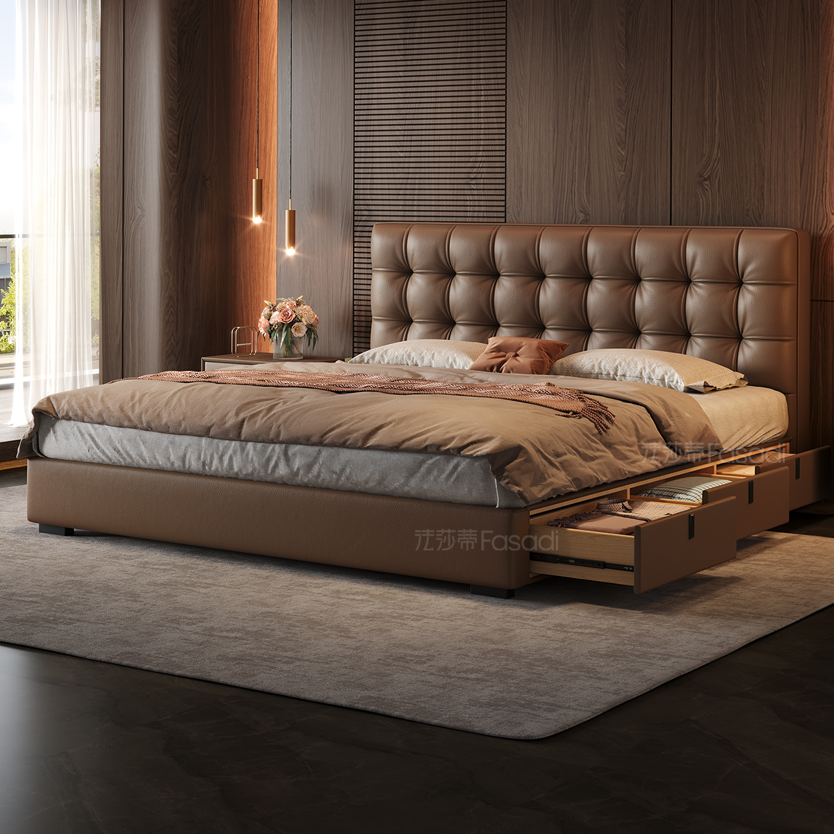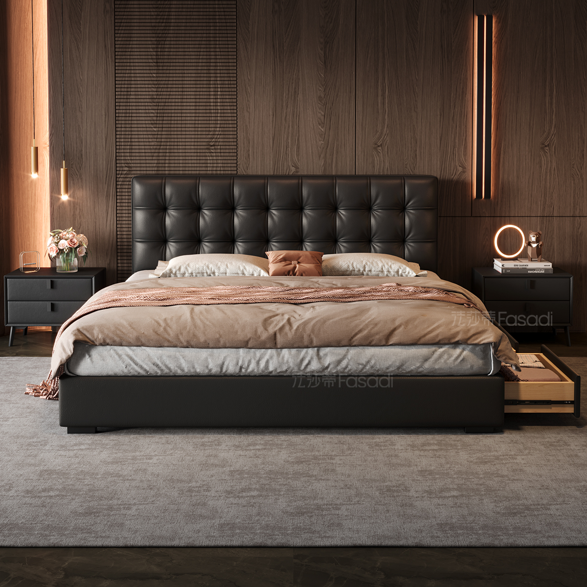 法莎蒂真皮床主卧意式 极简黑色轻奢小户型华夫格床气压高箱储物床