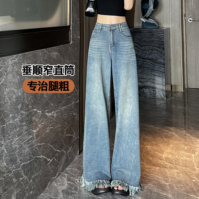 复古毛边牛仔裤 美式 女春夏高腰显瘦宽松直筒阔腿拖地裤 清仓