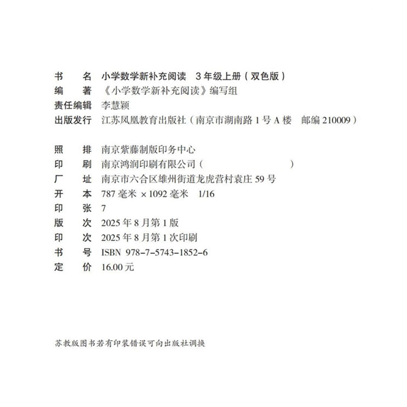 双色版 含参考答案 江苏凤凰教育出版 小学数学新补充阅读 社 小学教辅 三年级上册 小学数学课教学参考资料 2025秋 3上