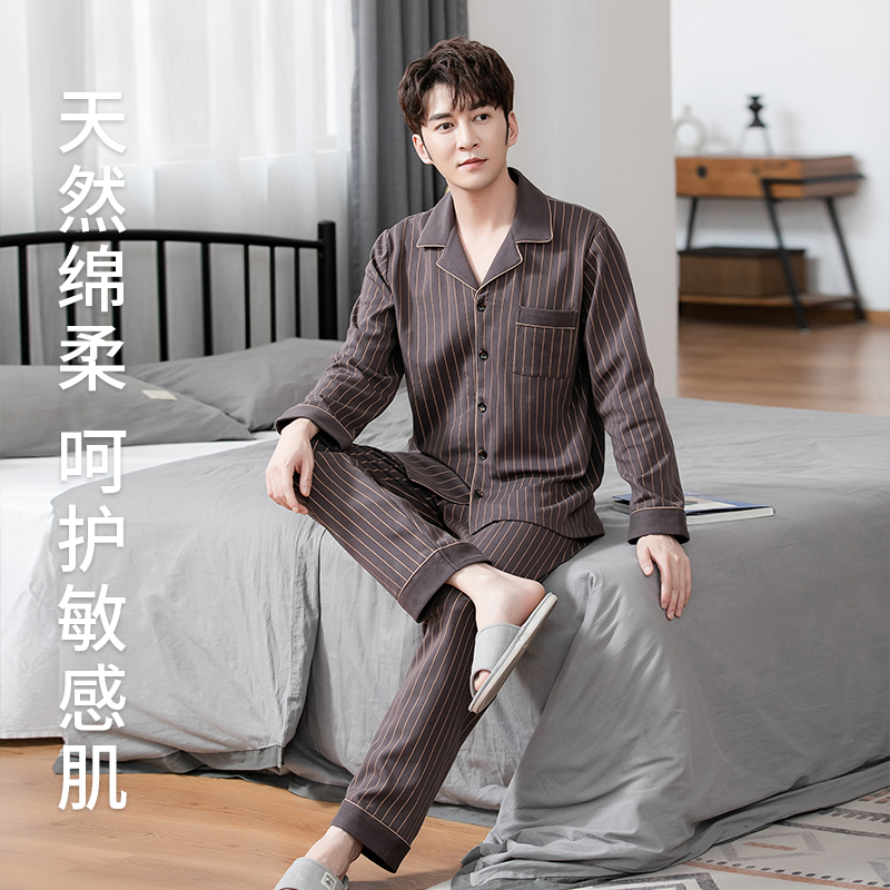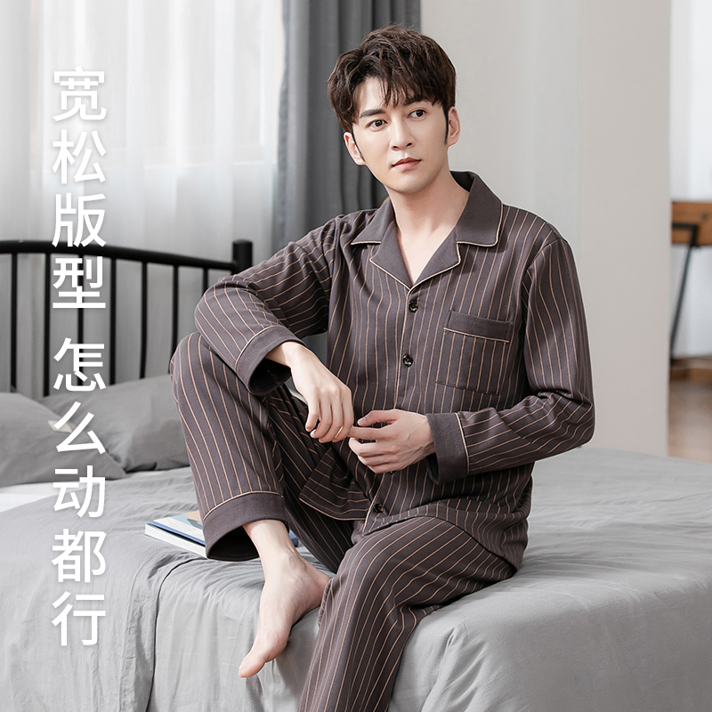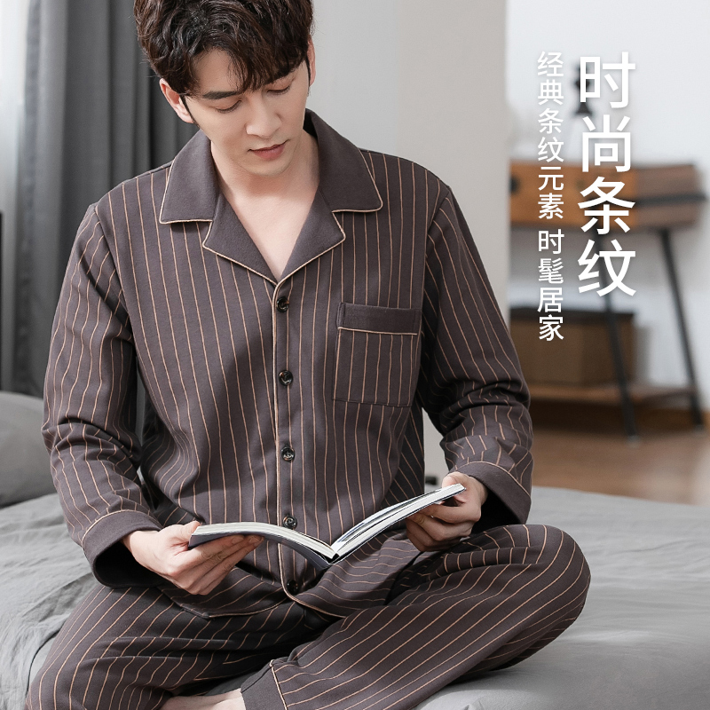 长裤 全棉条纹睡衣男士 长袖 翻领开衫 居家服 新一步 秋款 加大加肥