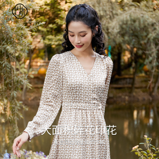荷叶边印花连衣裙42033LQ08520 复古v领泡泡长袖 固执秋季 新款