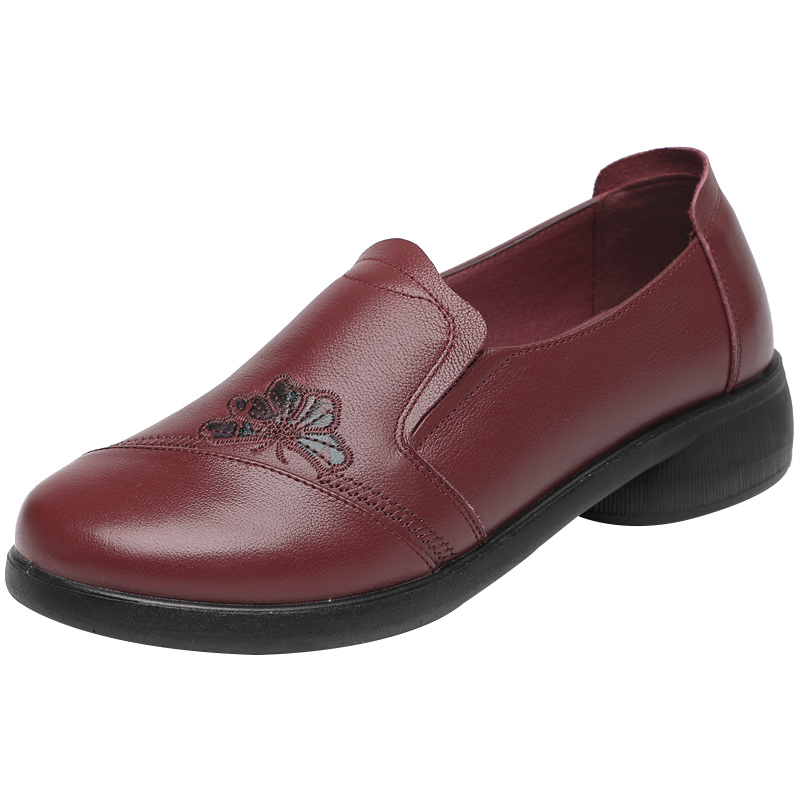 女鞋 真皮软底妈妈单鞋 中老年绣花大码 防滑一脚蹬奶奶皮鞋 清仓 秋季