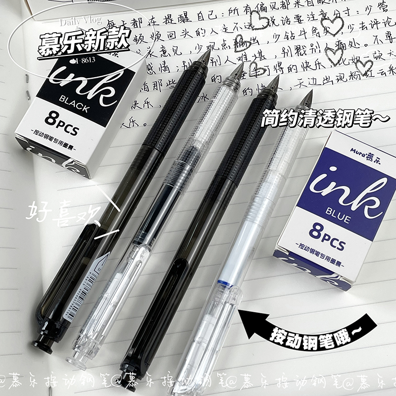 慕乐按动式 可替换可擦墨囊男女孩黑墨水刚笔文具 钢笔高颜值简约小学生三年级专用蓝色钢笔练字正姿自动按压式