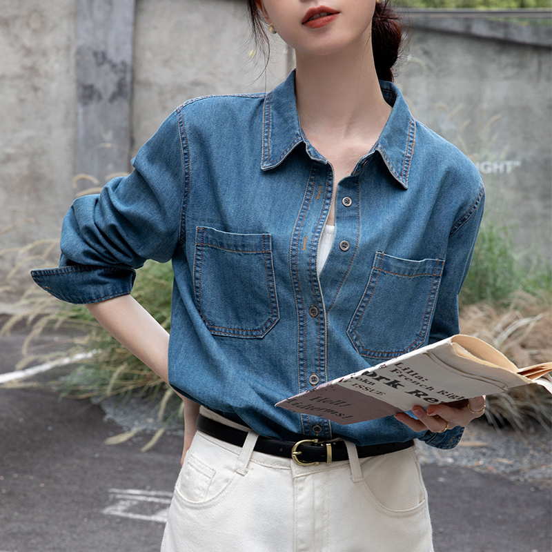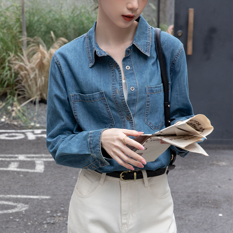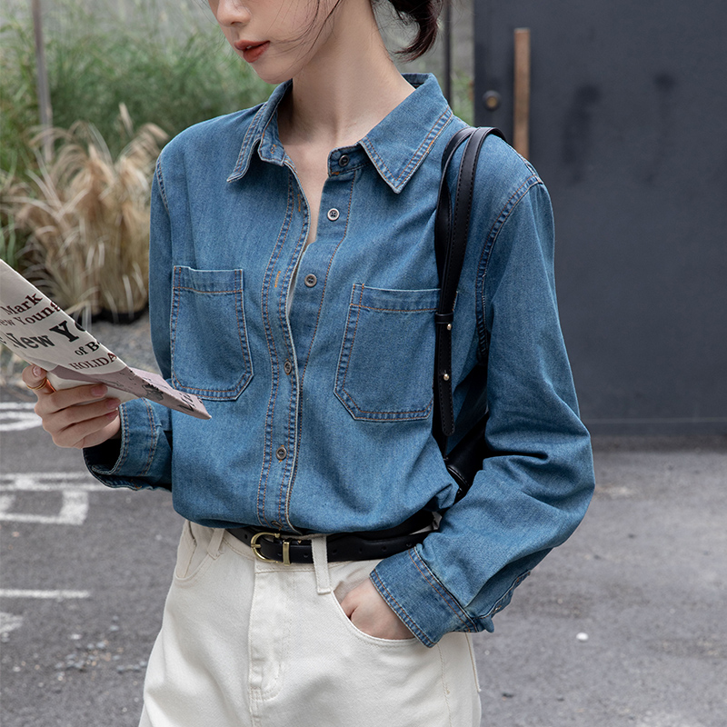 女百搭小个子正肩叠穿衬衣 复古做旧浅蓝色软牛仔衬衫 2025秋装 新款