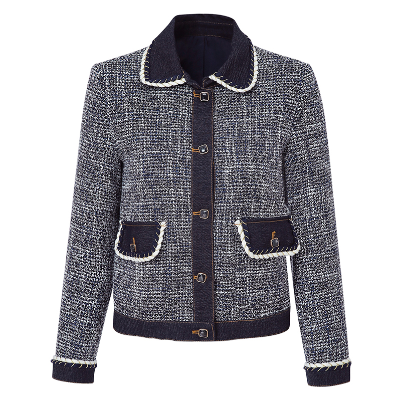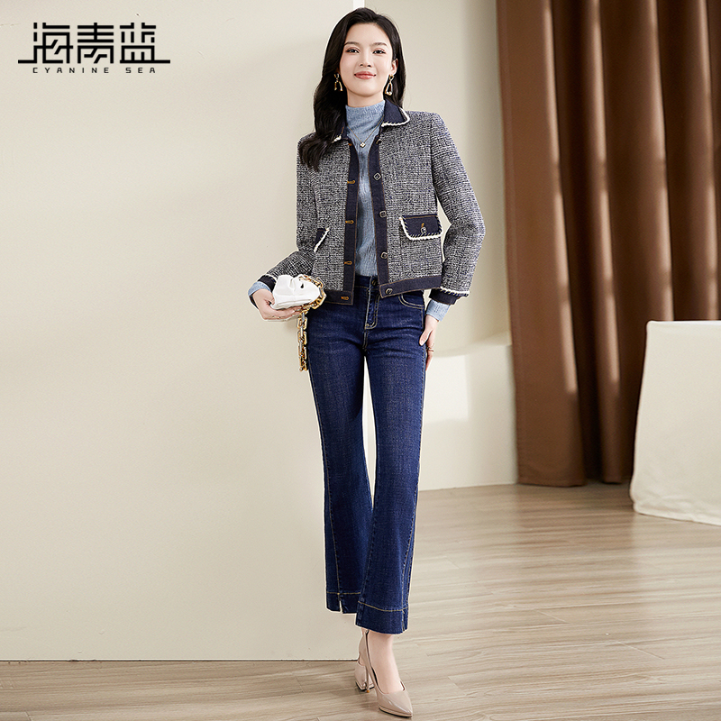 海青蓝高级感小香风牛仔拼接外套2025春装 复古港味千鸟格上衣 新款
