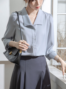 公务员面试通勤衬衫 2025秋装 女v领小个子职业装 别致蓝色衬衫 新款