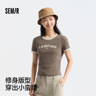 字母上衣个性 森马短袖 修身 正肩撞色复古风2025夏季 体恤 T恤女短款