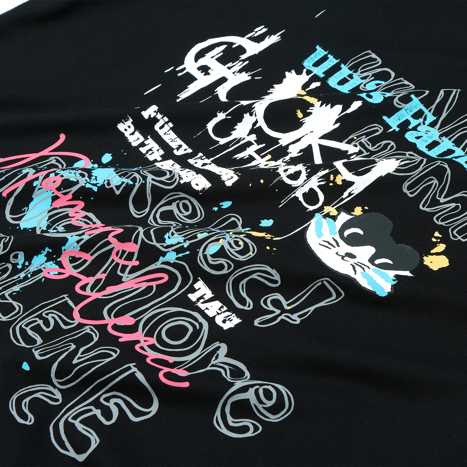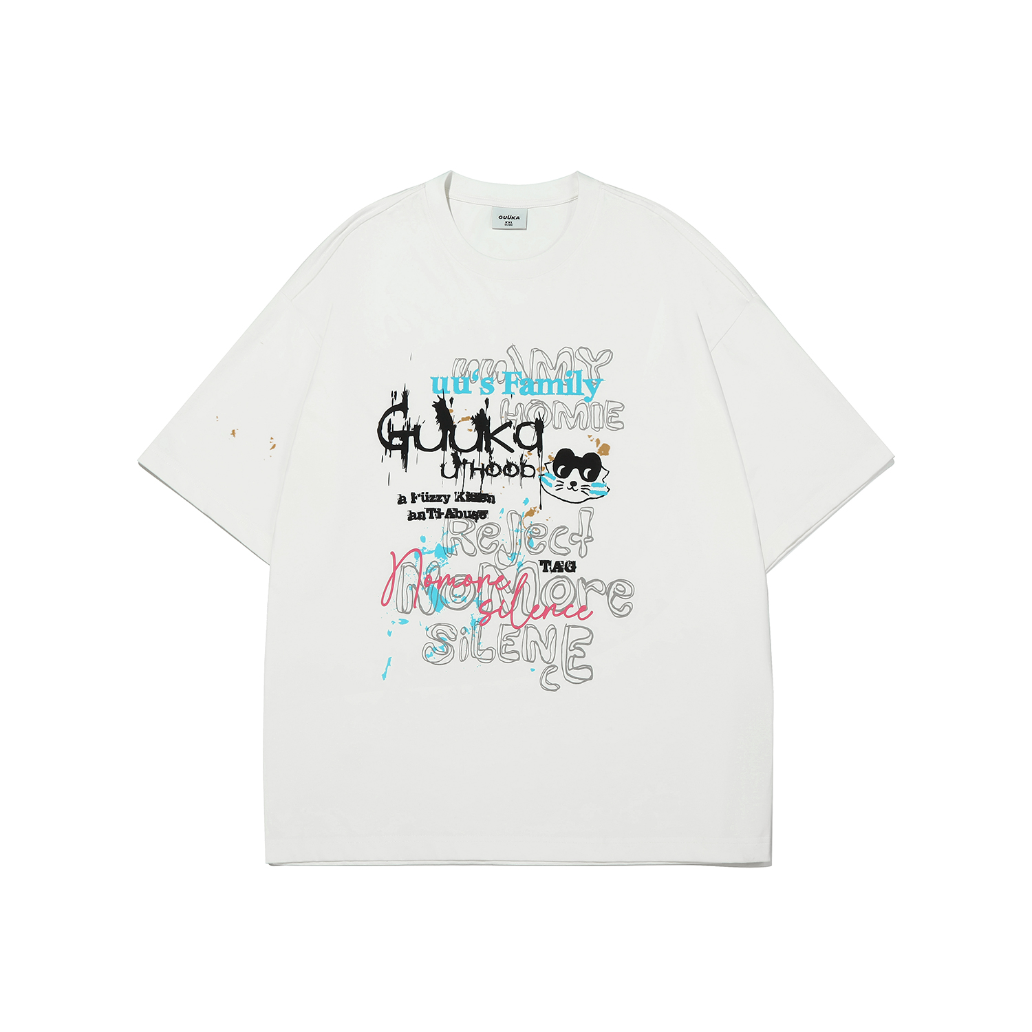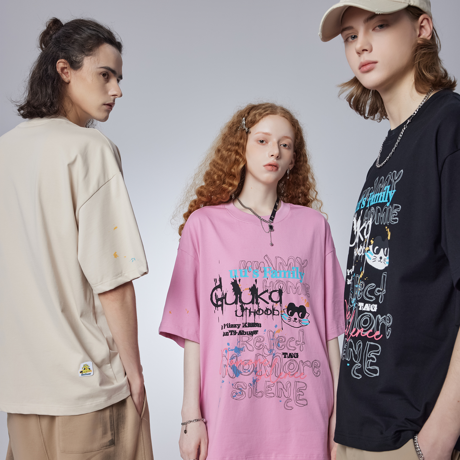 潮情侣猫系涂鸦落肩半袖 新款 宽松 T恤男纯棉夏季 GUUKA多色重磅短袖