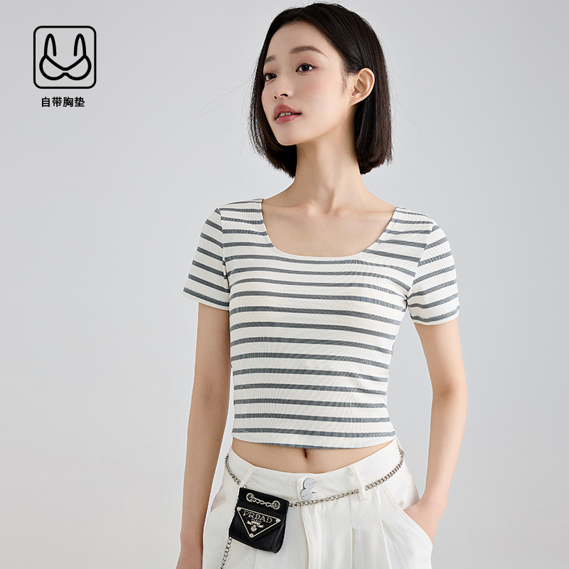 薄冰感正肩方领显瘦免穿文胸短款 2024新款 上衣 女t恤夏季 冰丝短袖