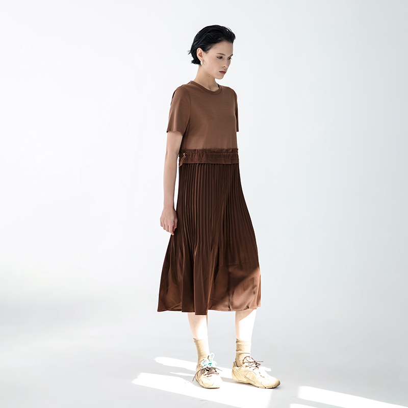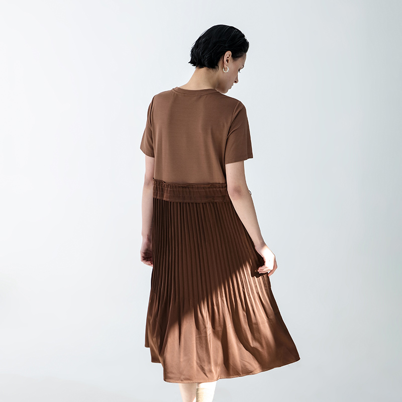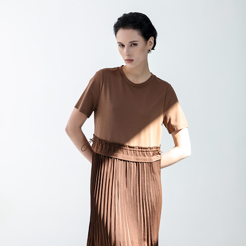 Keywearcloud奇威秋季 束绳显瘦圆领收腰拼接大摆气质通勤连衣裙
