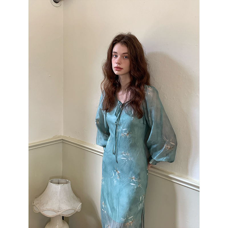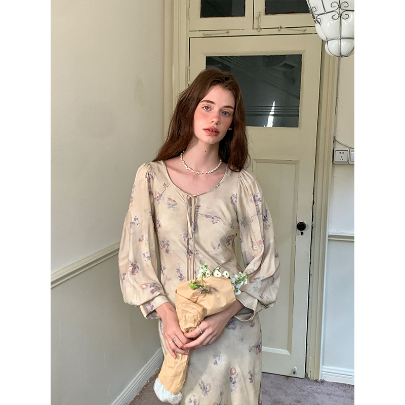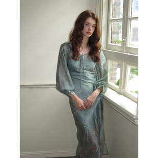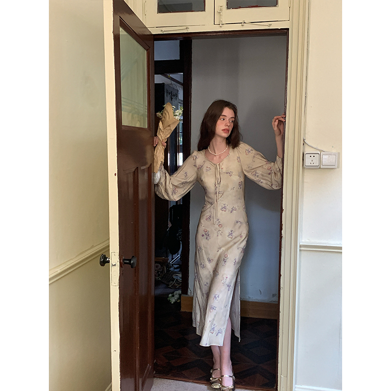 高级感气质开叉茶歇裙 长款 竹依依法式 玫瑰晕染方口领连衣裙春季