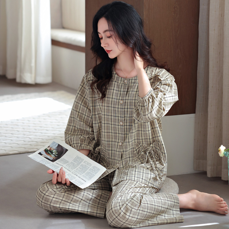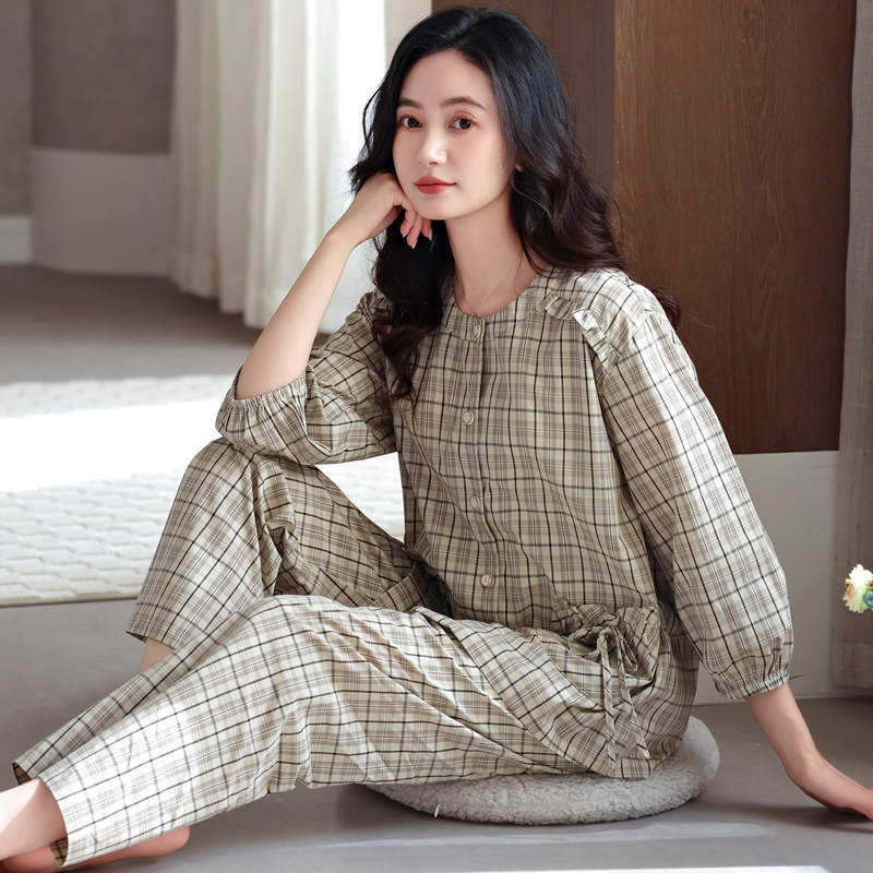 女士家居服套装 圆人睡衣女夏季 格子春夏九分裤 大码 梭织纯棉七分袖