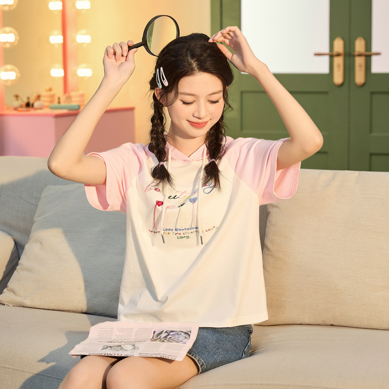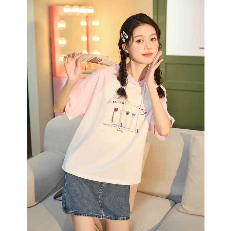 新款 卫衣帽衫 女T恤插肩袖 上衣春夏撞色刺绣半袖 短袖 唐狮夏季