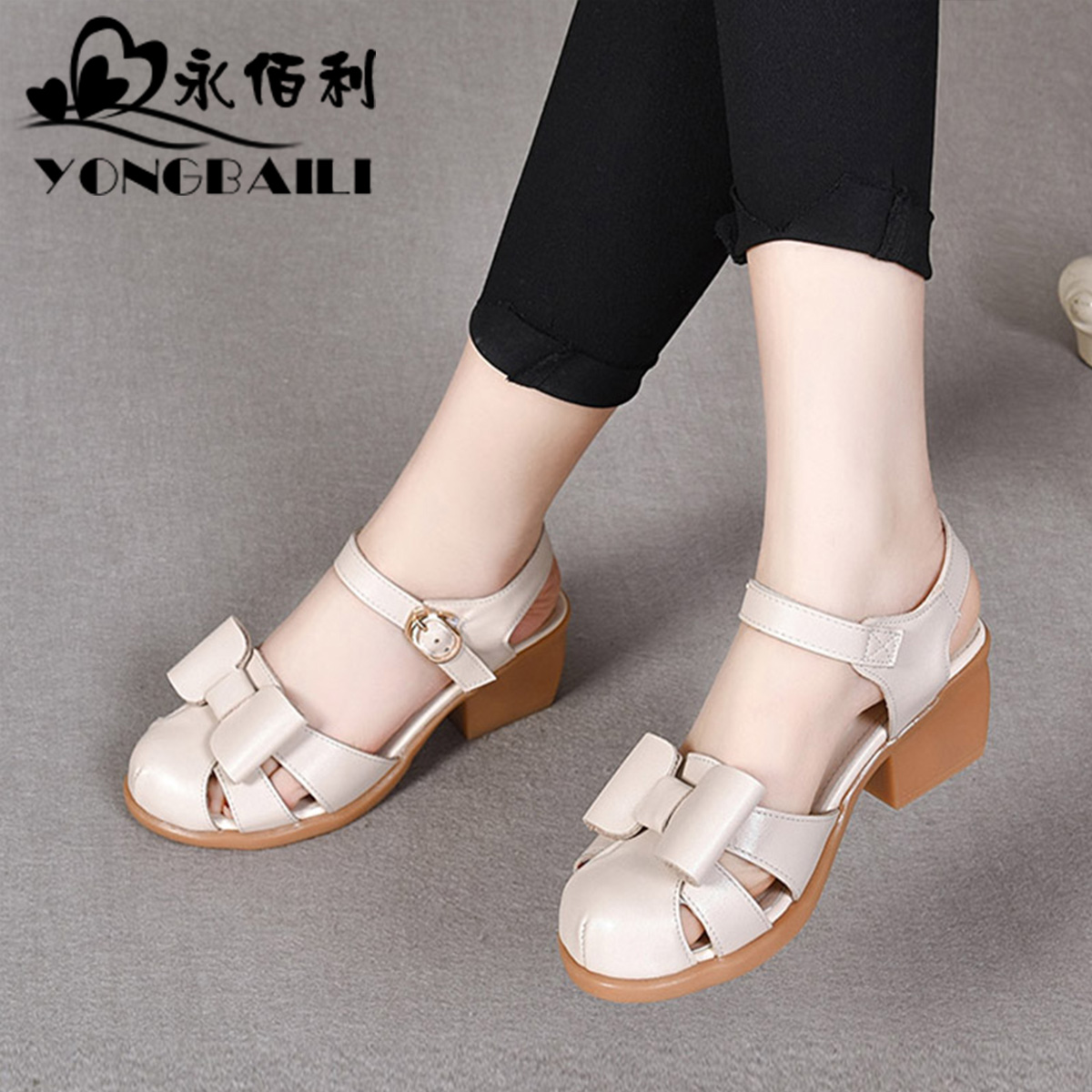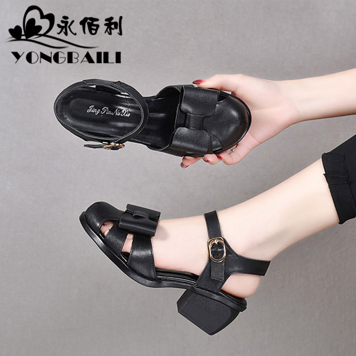 皮鞋 包头中空圆头厚底休闲一字扣粗跟女鞋 真皮凉鞋 2025春夏新款