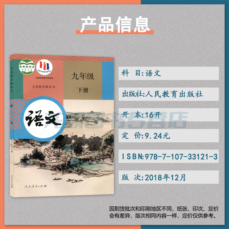 社义务教育教科书初三下学期语文书课本教材人教版 全新正版 初中语文九年级下册人民教育出版 人教版 初中语文9九年级下册 新版