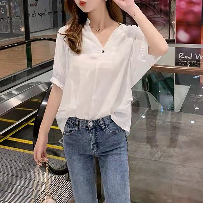 宽松小众漂亮小衫 女士v领衬衫 泡泡袖 设计感上衣夏款 不规则 白短袖
