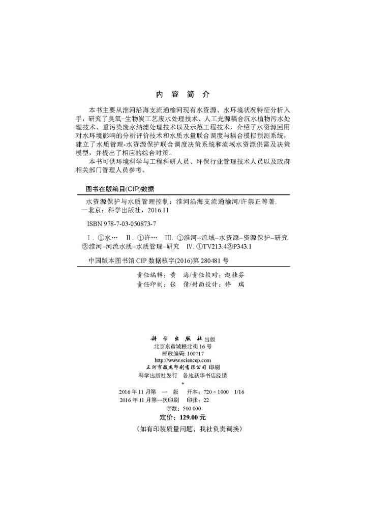 科学出版 正版 许崇正著 水资源保护与水质管理控制—淮河沿海支流通榆河 社 现货