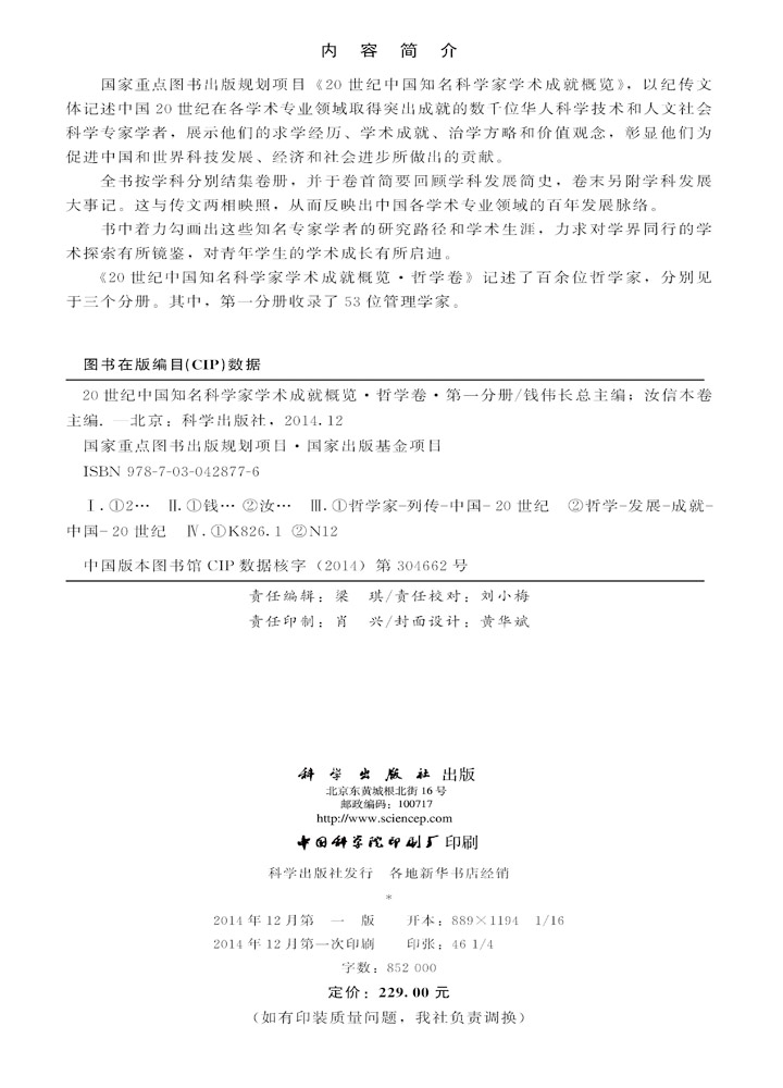 科学出版 正版 汝信主编 20世纪中国知名科学家学术成就概览·哲学卷·第一分册 社 现货