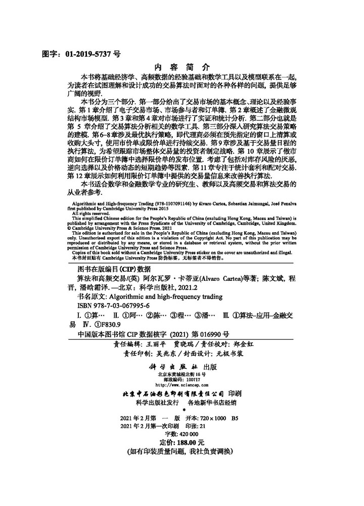 现货算法和高频交易科学出版 社