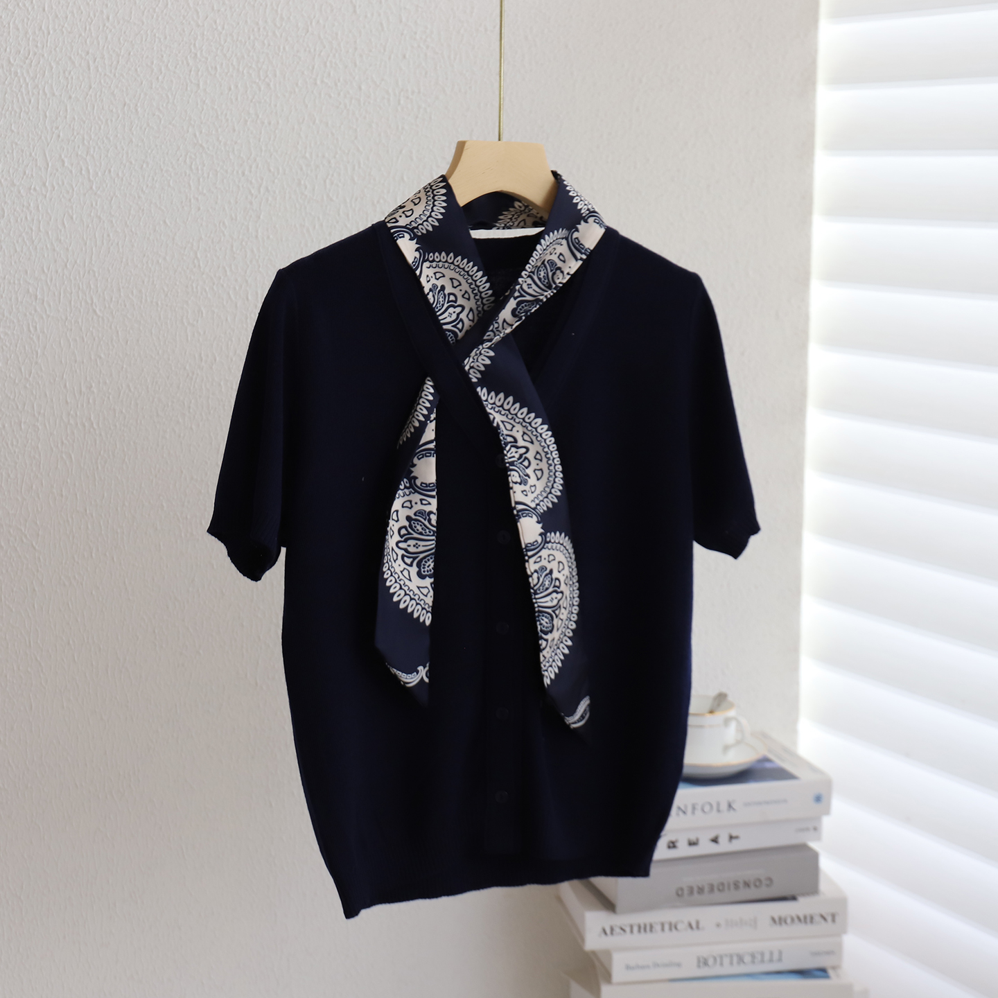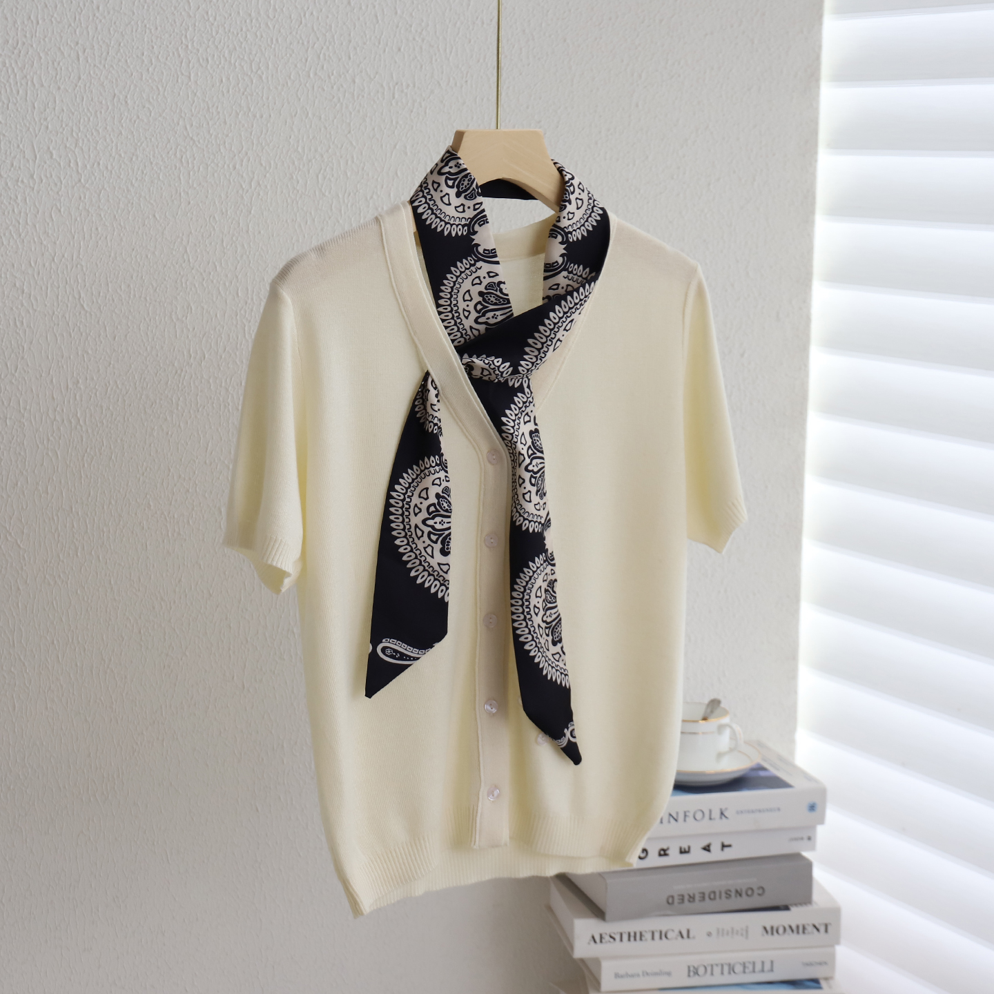 上衣 2025巨好看宽松外穿上班通勤薄开衫 短袖 t恤女带丝巾v领针织衫