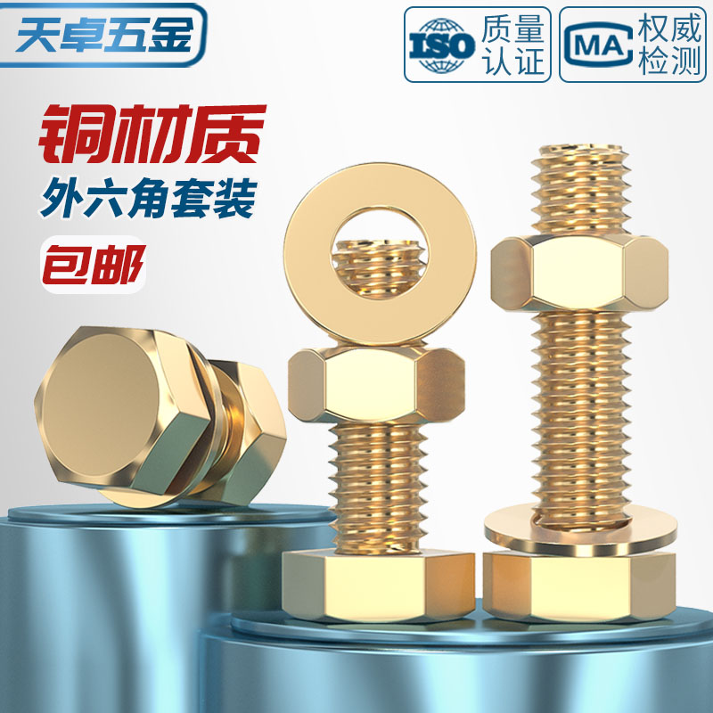 国标纯黄铜螺丝平垫螺母套装 全外六角铜螺栓组合4M5M6M8M10M12M16