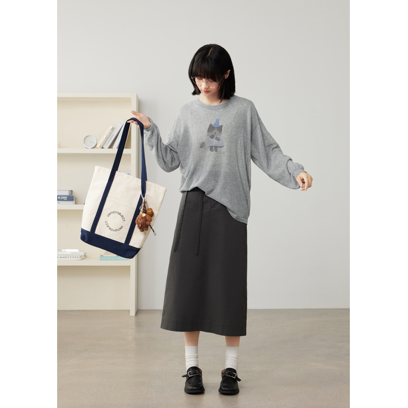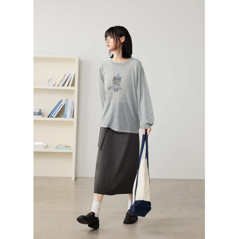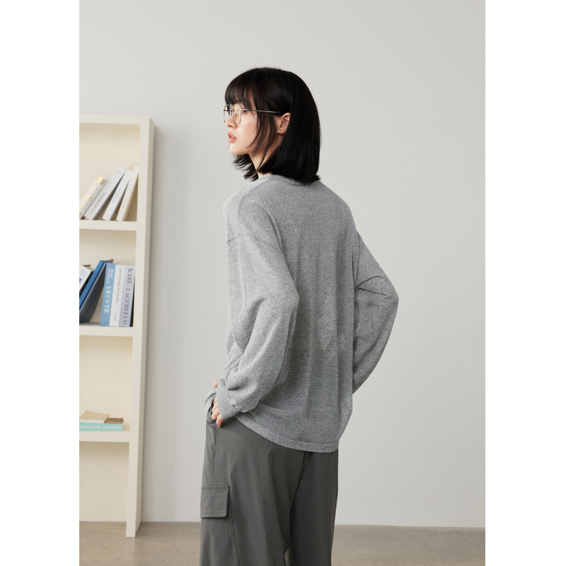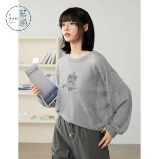 松弛宽松显瘦印花微透罩衫 紫涵灰色圆领长袖 新款 女2025秋季 针织衫
