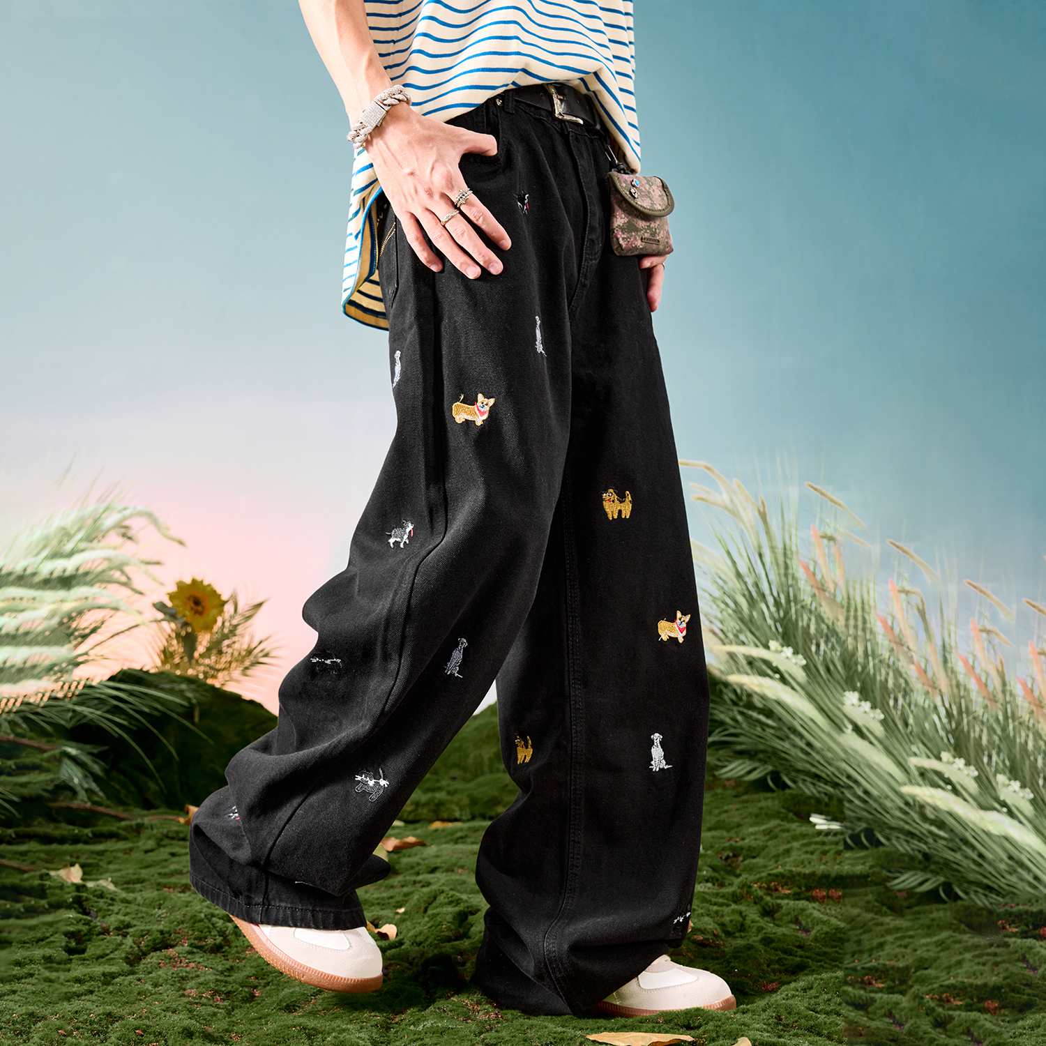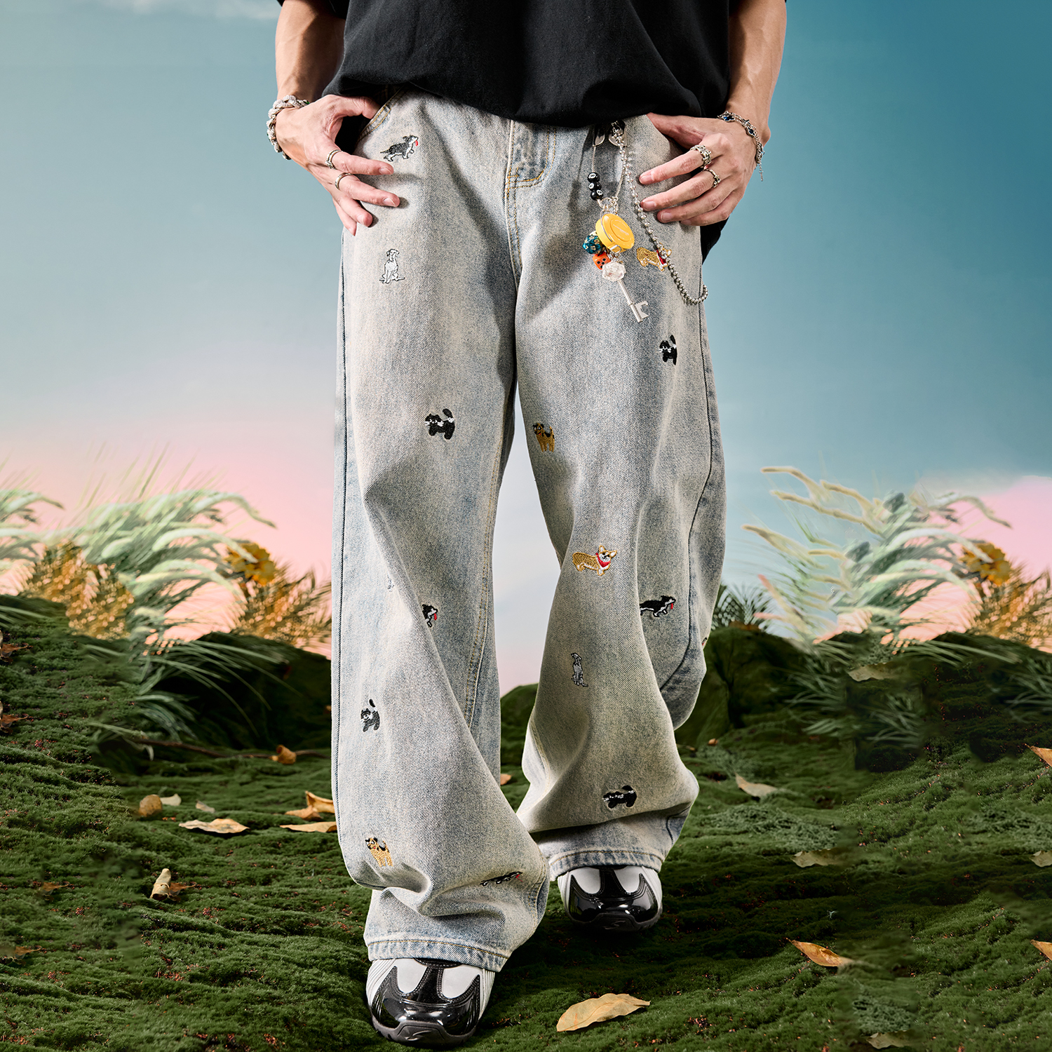 小个子长裤 浅蓝色小熊刺绣牛仔裤 女春秋设计感小众显瘦直筒阔腿裤