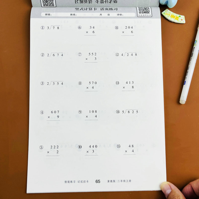 计算活页练习册专项训练课本同步练习册每天10分钟倍 三年级上册数学竖式 冀教版 认识口算笔算乘法笔算除法连乘连除 随堂帮