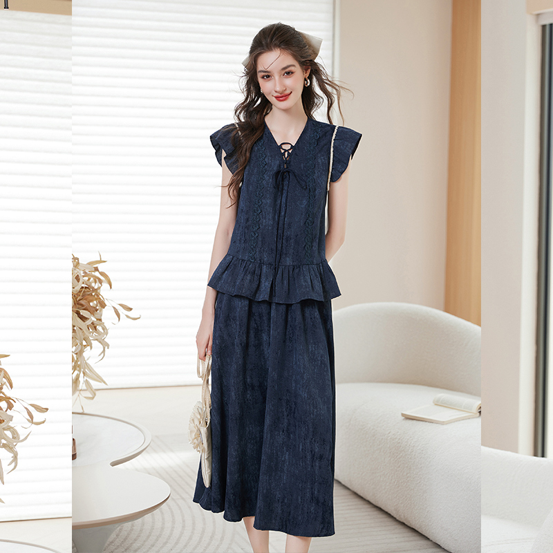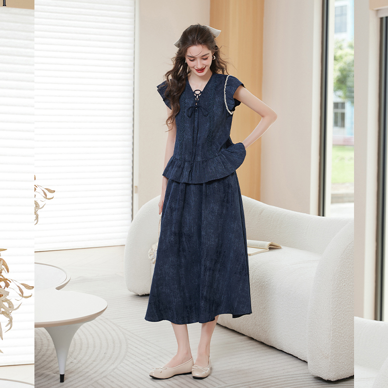 套装 时尚 复古花边V领荷叶边上衣半身裙两件套25夏新款 白鹿语法式