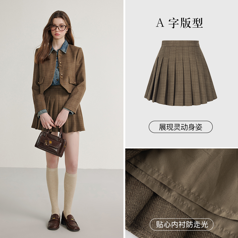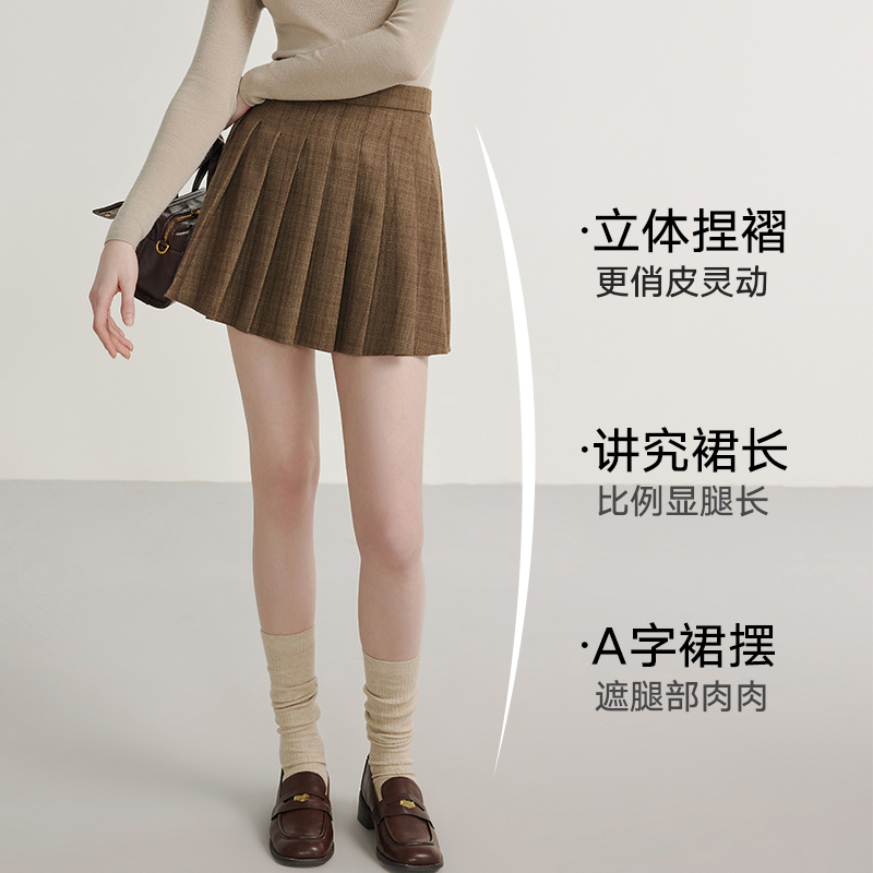 KBNE咖色半身裙学院风百褶裙春秋新款 A字裙小个子半裙气质短裙女