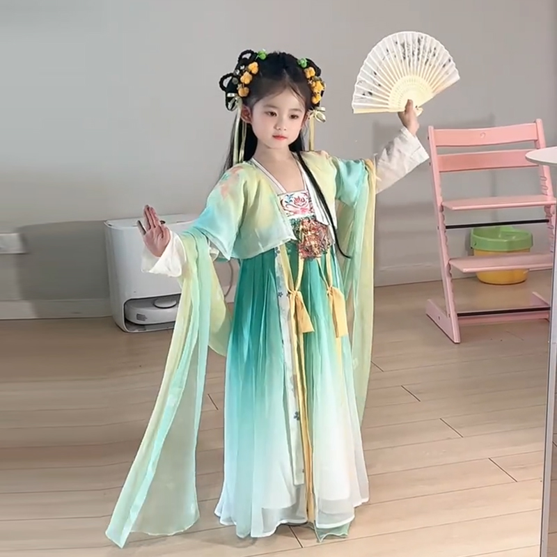 汉服女童唐装 古典舞国风儿童超仙连衣裙 寄明月扇子舞蹈凌妙妙同款