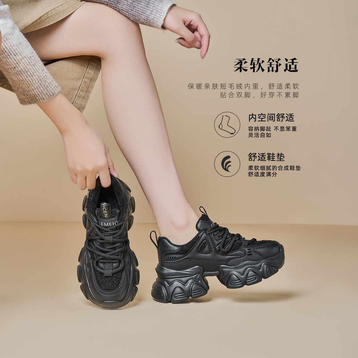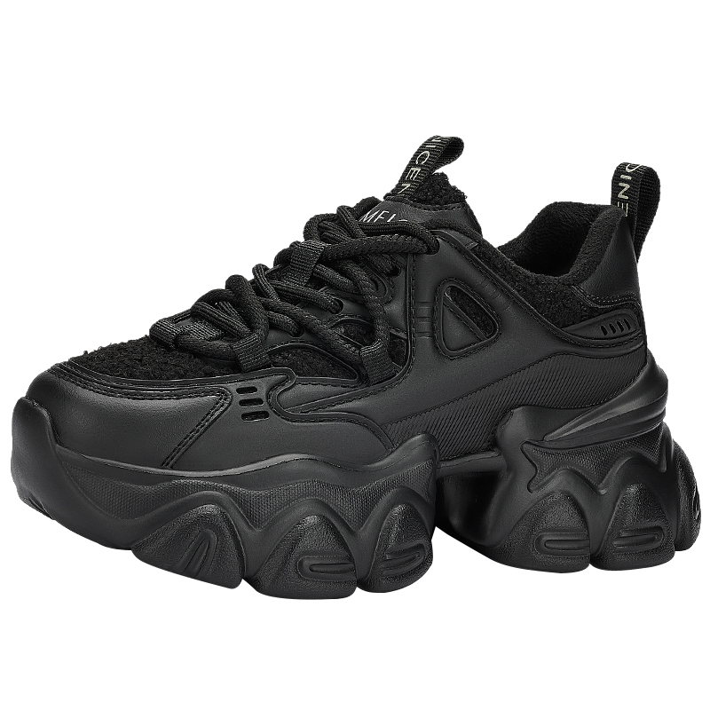 女款 骆驼女鞋 女加绒增高休闲黑色运动鞋 厚底老爹鞋 2025年秋冬新款