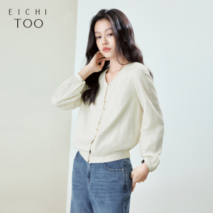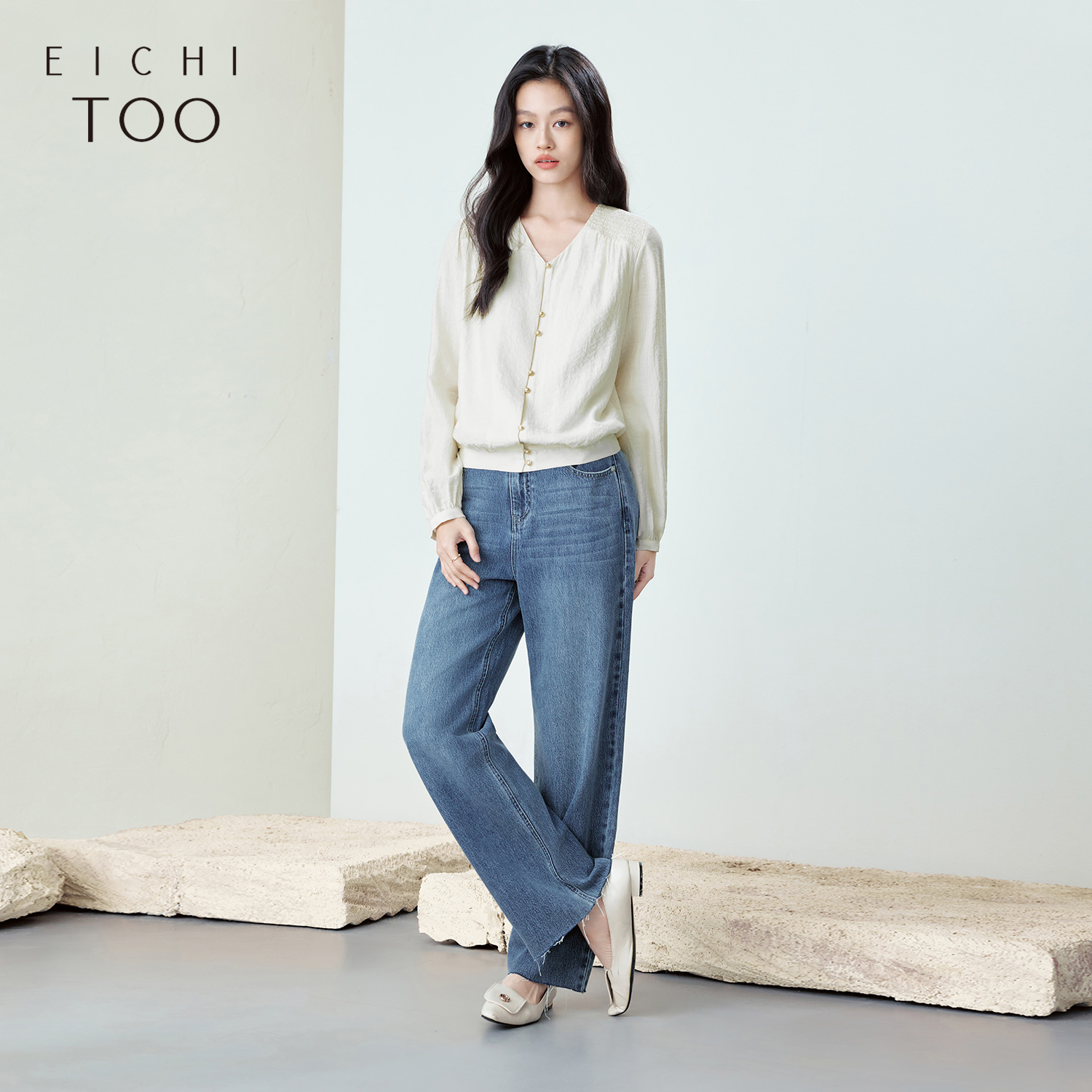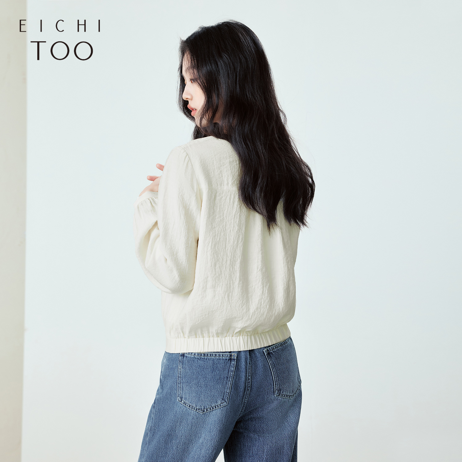 新款 女2025年春季 宽松浅色上衣 衬衫 爱居兔复古V领褶皱肌理感长袖