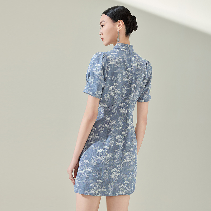 新中式 MOFAN摩凡2025春秋蓝色花纹立领盘扣连衣裙 提花旗袍裙短款