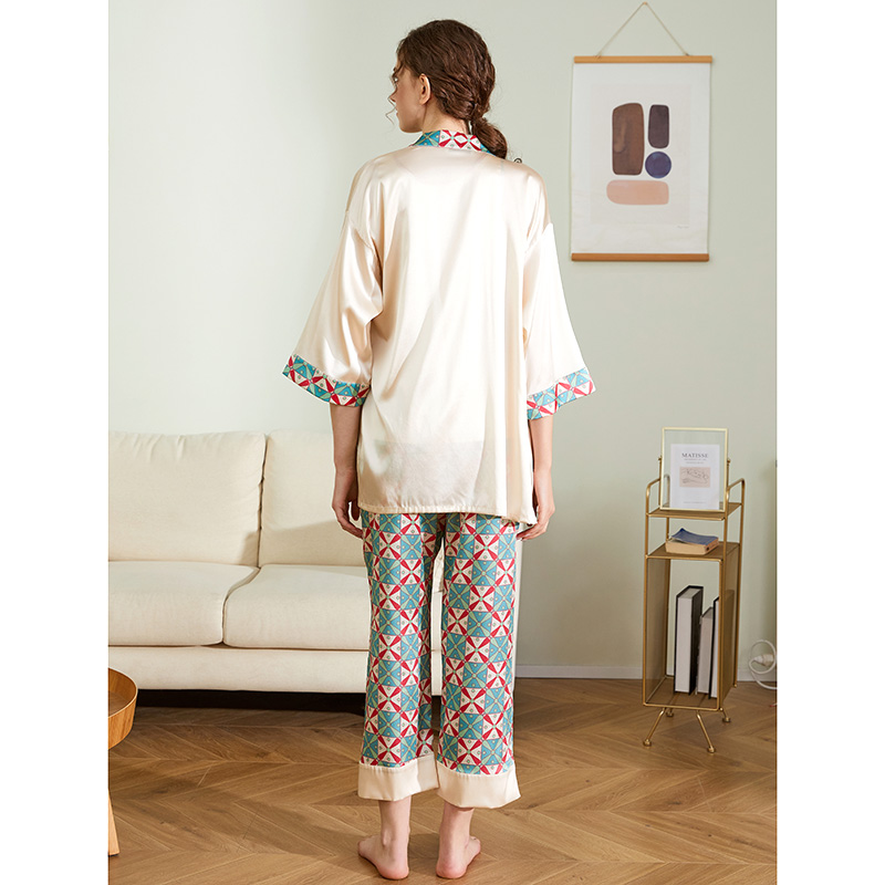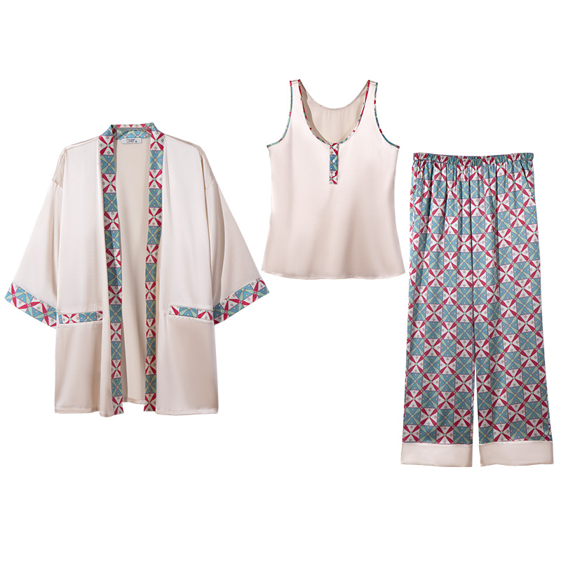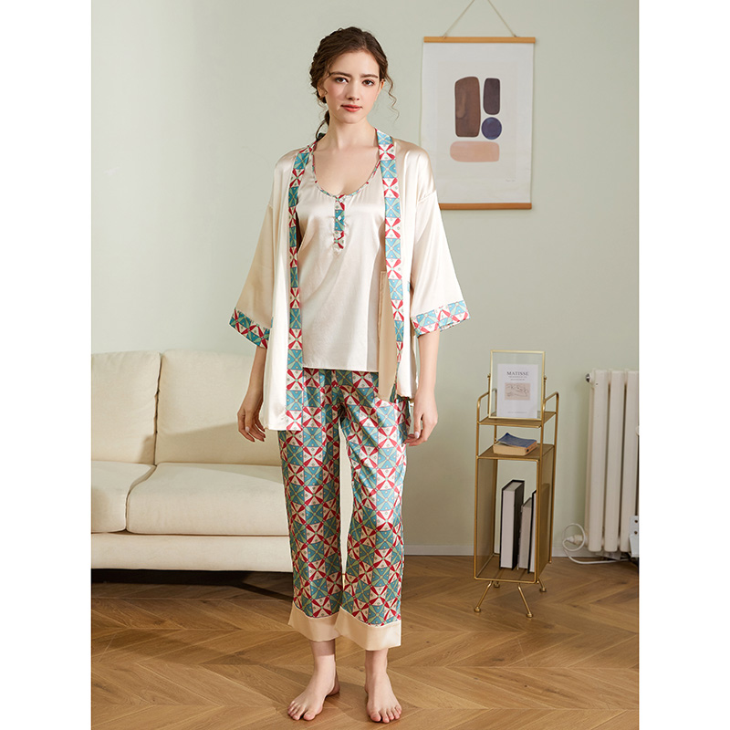 真丝三件套装 女春秋夏睡衣家居服甜美可外穿有机桑蚕丝睡袍中长款
