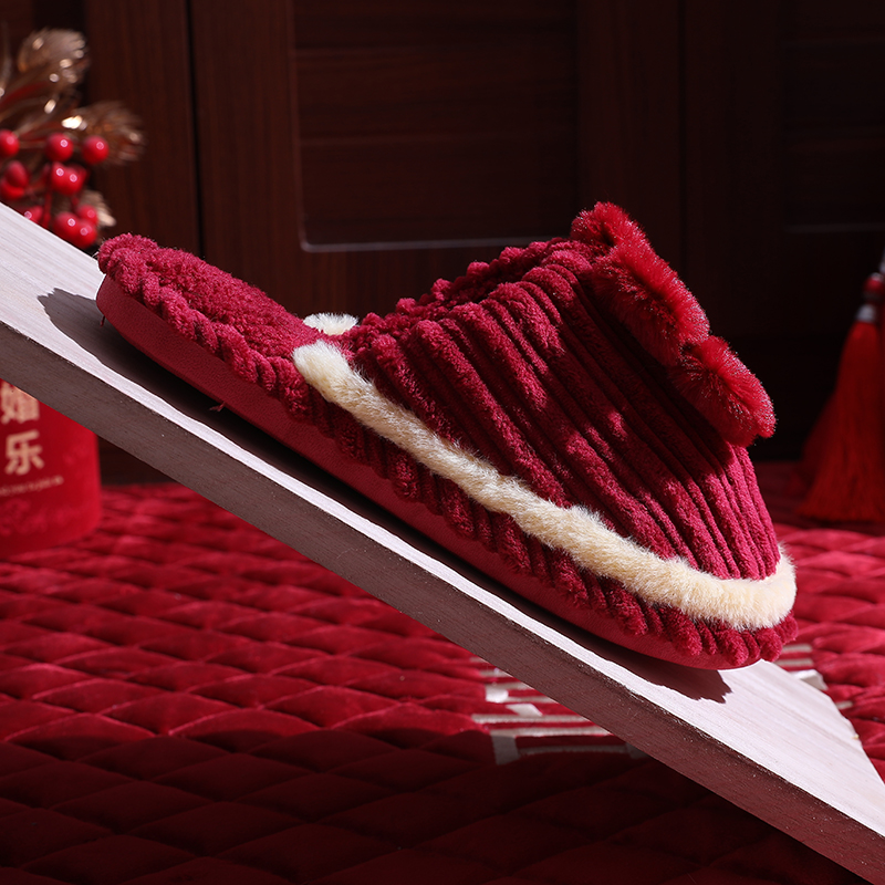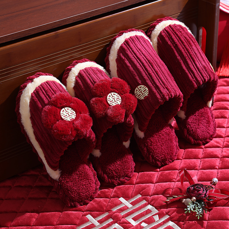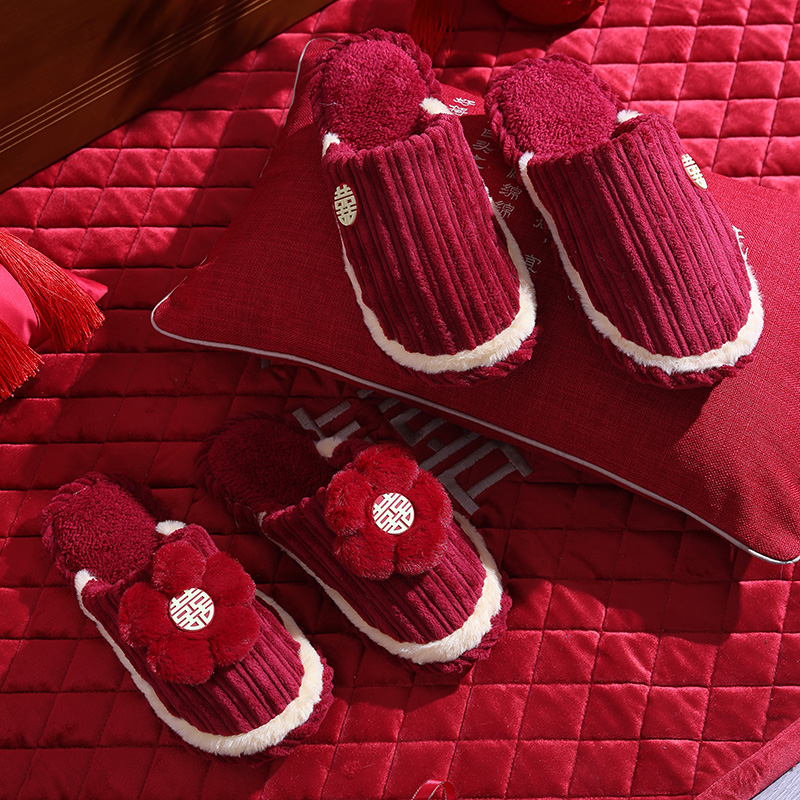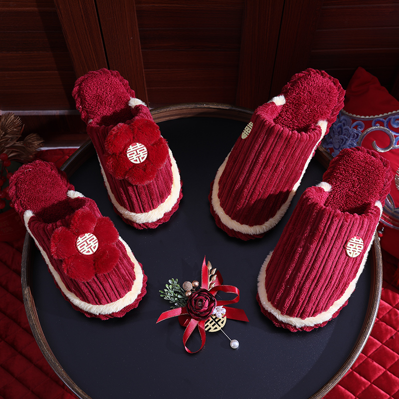 结婚男方女方情侣居家拖鞋 一对酒红色高档红色轻奢新娘陪嫁婚庆用