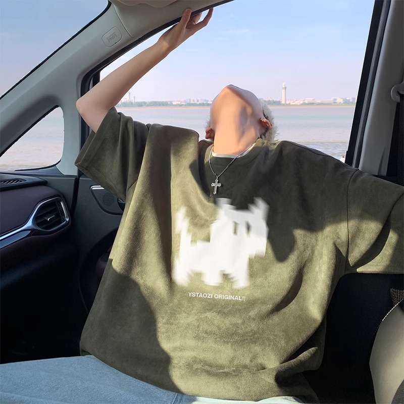 宽松潮牌青少年磨毛半袖 t恤男夏季 300斤乌梅紫色像素小猫短袖 大码