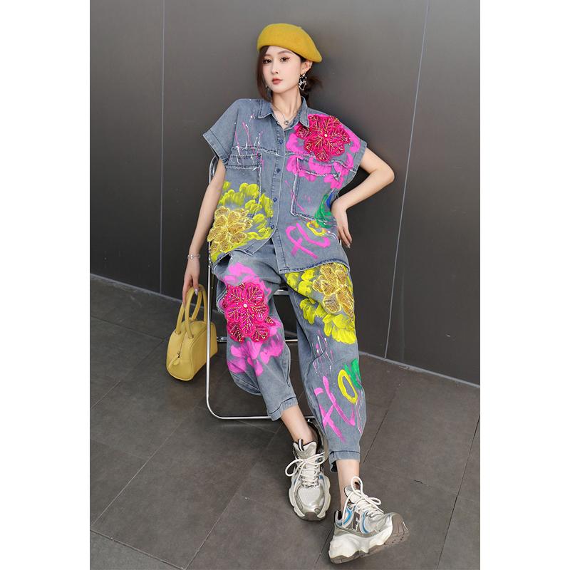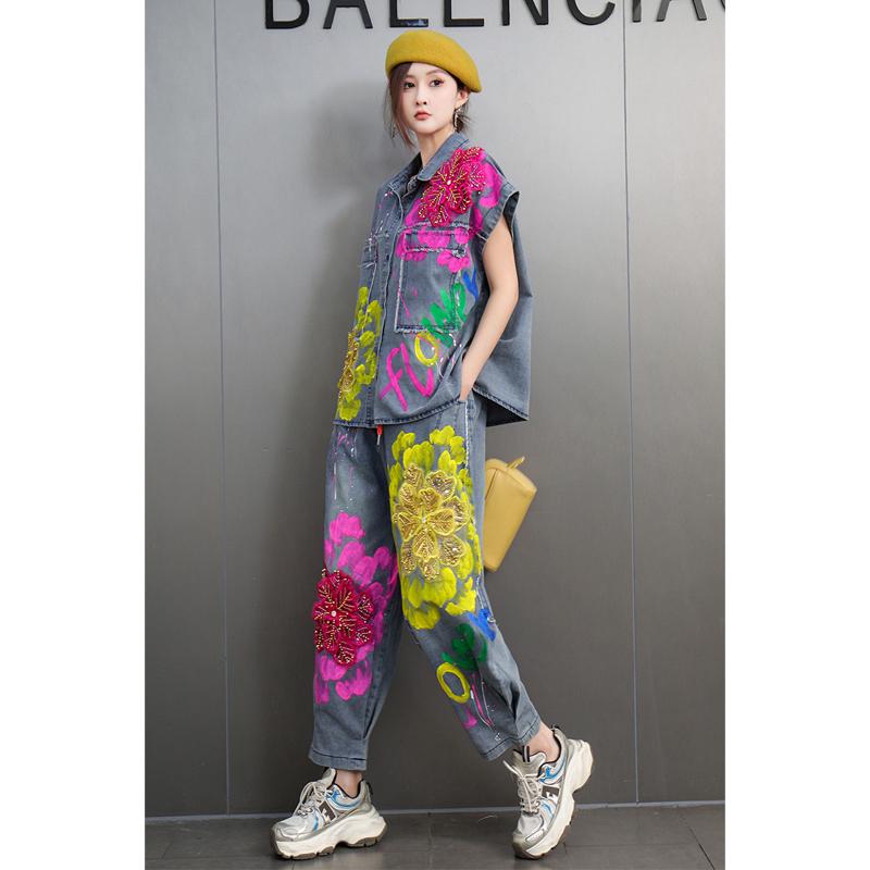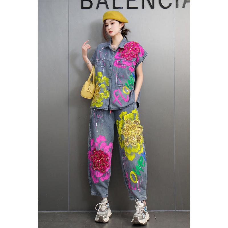 大码 女亮片刺绣花朵外套哈伦裤 牛仔套装 复古小众设计感2025秋新款