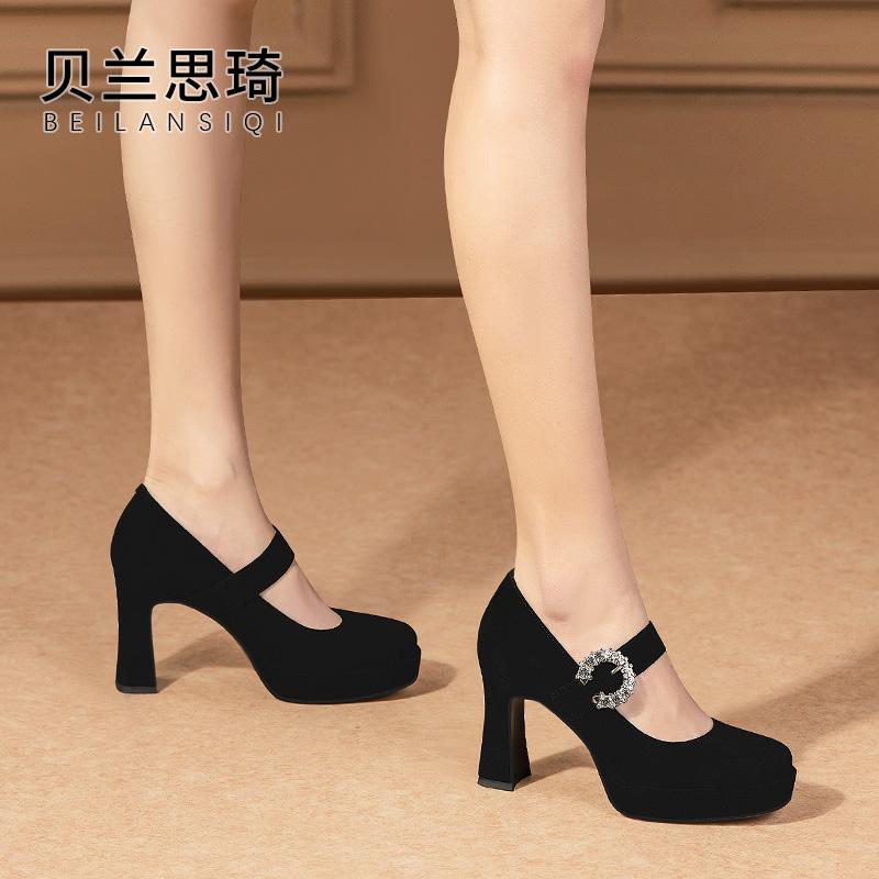 浅口防水台高跟鞋 磨砂真皮水钻一字带厚底粗跟单鞋 女2025春秋季